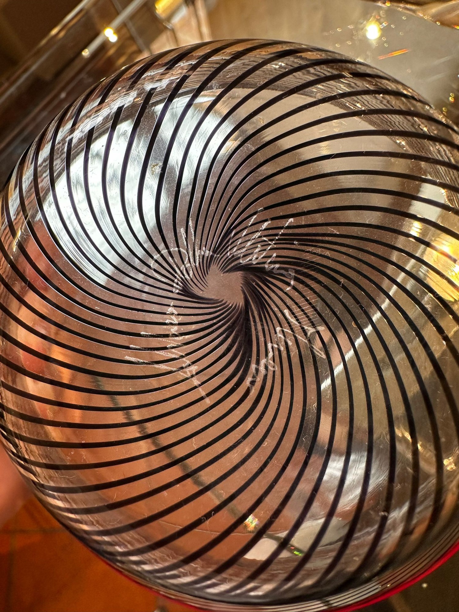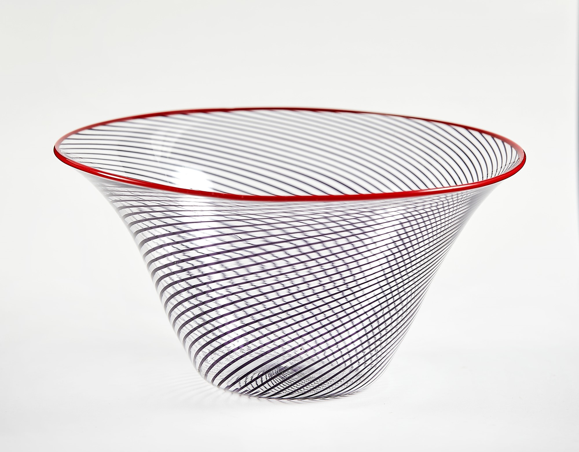 ADRIANO DALLA VALENTINA (Murano 1945) Vaso in vetro lavorato a canne con bordatura rossa. XX secolo, Italia. Cm 10x19. Sotto la base reca firma all'acido Adriano Dalla Valentina, Murano.