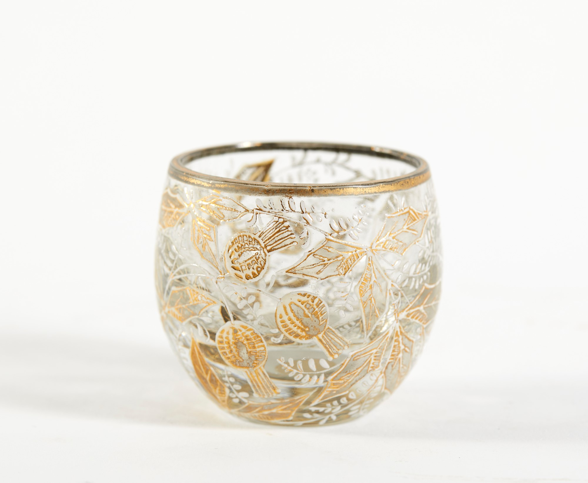 EMILE GALLE' attr. Bicchierino in vetro decorato con motivi floreali bianchi e oro. XIX secolo, Francia. Cm 5x5.