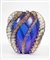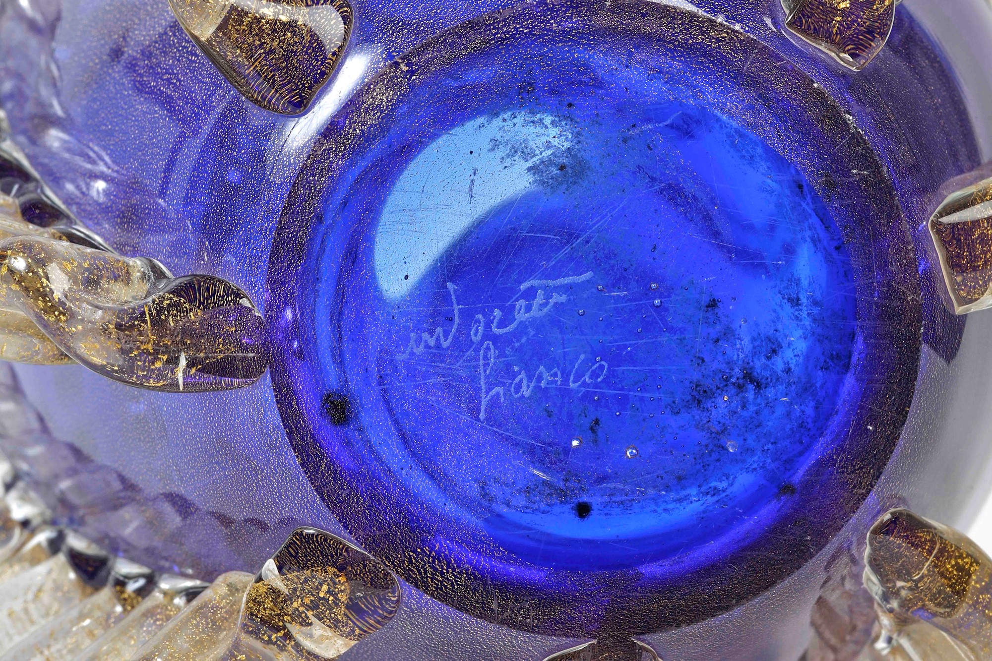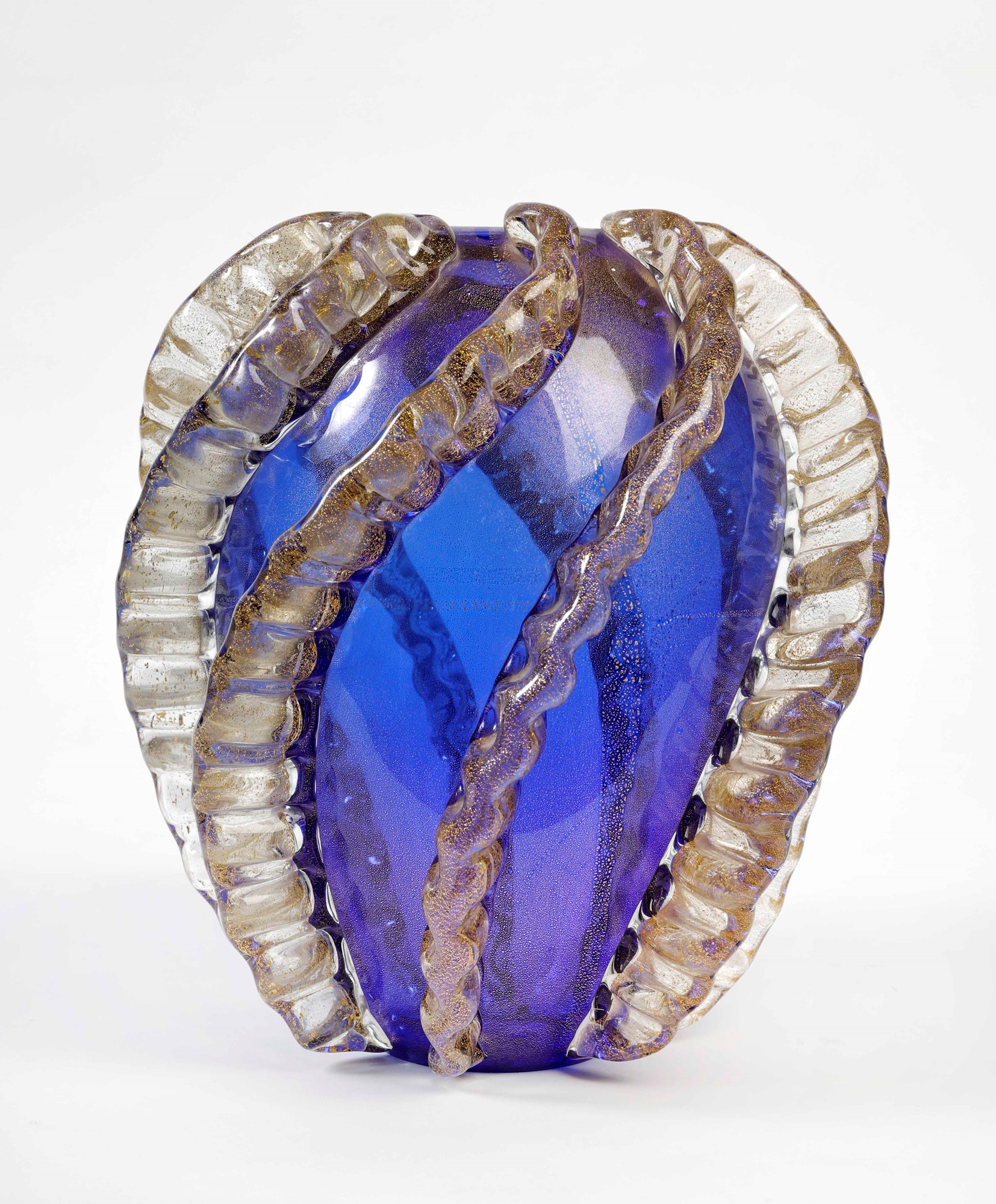 FRANCO MORETTI Vaso in vetro soffiato blu con applicazioni a caldo. Cm 27,5x19. Sotto la base reca firma a punta di diamante Franco Moretti.