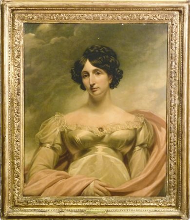 SCUOLA INGLESE DELLA PRIMA METÀ DEL XIX SECOLO Ritratto di Ann Caroline moglie di Henry J. T. Drury olio su tela, in cornice intagliata e dorata cm 76x63 Ann Caroline visse tra il 1786 e il 1864 Reca cartiglio sulla cornice - With label on the frame: Ann Caroline wife of Henry J. T. Drury born 1786 at Narcott Hall, co. Rutland d. 1864; Al verso reca cartiglio - With label on reverse: Ann Caroline Drury […] of A. W Tayler of Boreham Wood [...] Herts b. at Morcott Hall. […] Rutland 23 Aug. 1786 married 20 Dec. 1808 Rev .d Henry Joseph Thomas Drury of Harrow. Died at […] Torquay. 14. O. r 1864. ENGLISH SCHOOL OF FIRST HALF OF 19TH CENTURY, PORTRAIT OF ANN CAROLINE WIFE OF HENRY J. T. DRURY, OIL ON CANVAS. ANN CAROLINE WAS BORN IN BETWEEN 1786 AND 1864