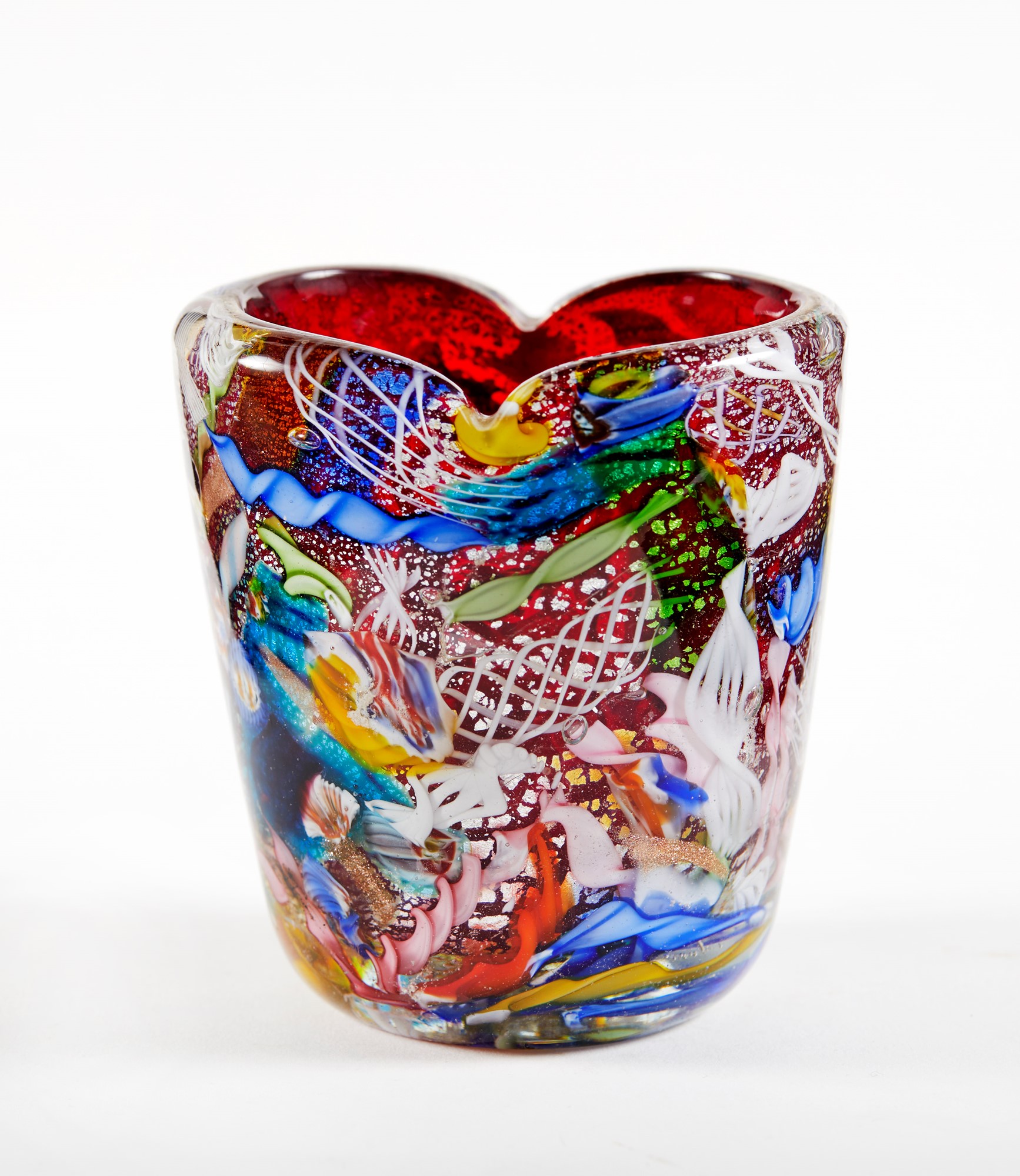 A.V.E.M.Piccolo vaso in vetro multicolore ottenuto dalla fusione di murrine. 1950 circa, Toso, Italia. Cm 10x9,5x8.