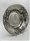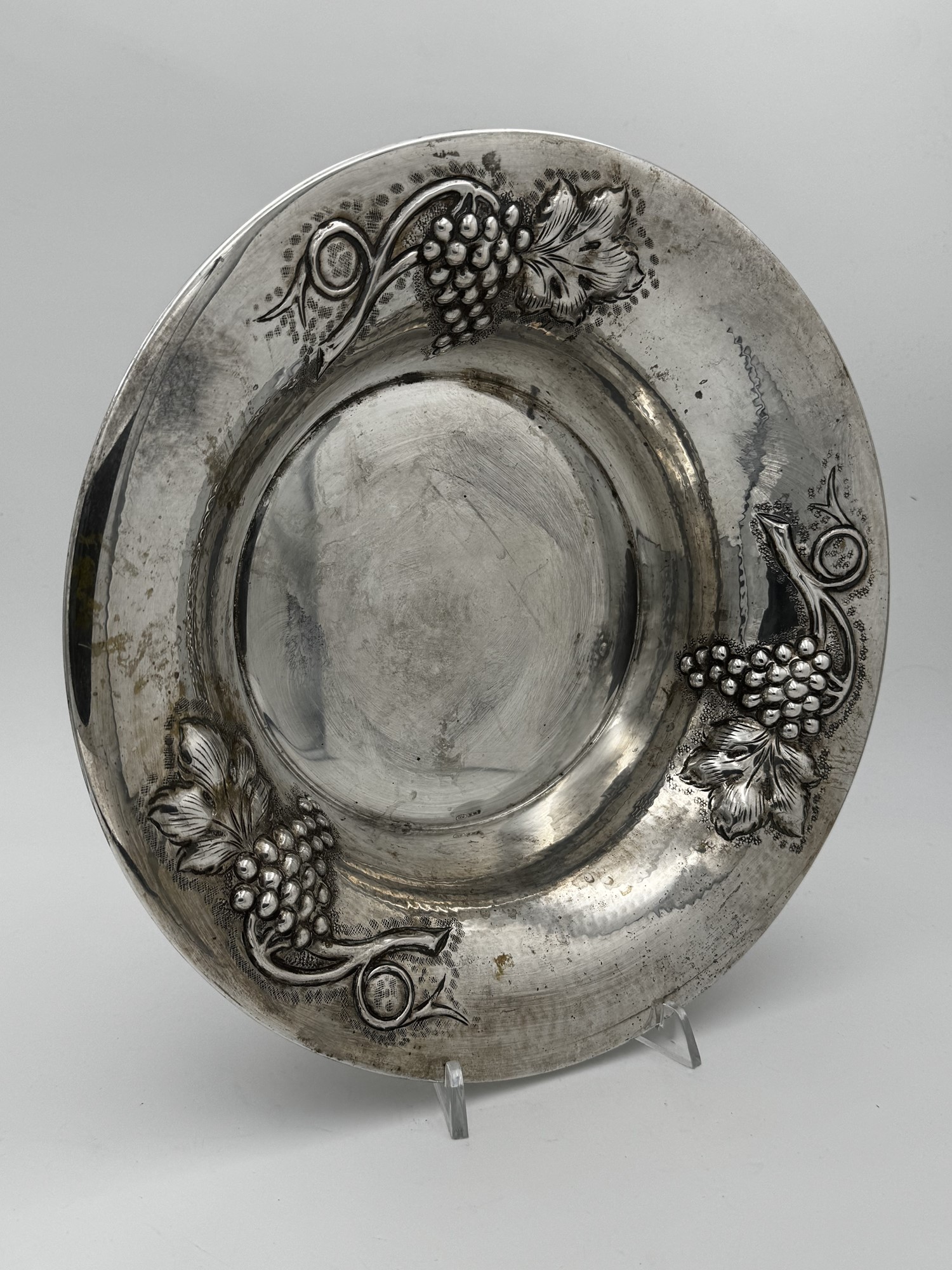 Piatto in argento 800 con decori a foggia di uva. XX secolo. Cm diametro 30. Peso: 555 gr. Reca punzone 800.