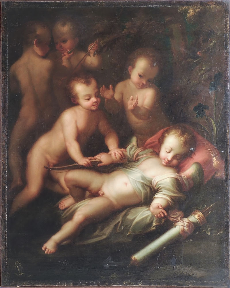 DESIDERIO DE ANGELIS (1743-1811) Amore dormiente con puttini olio su tela, firmato cm 131x104,5 SLEEPING AMOR WITH PUTTI, OIL ON CANVAS