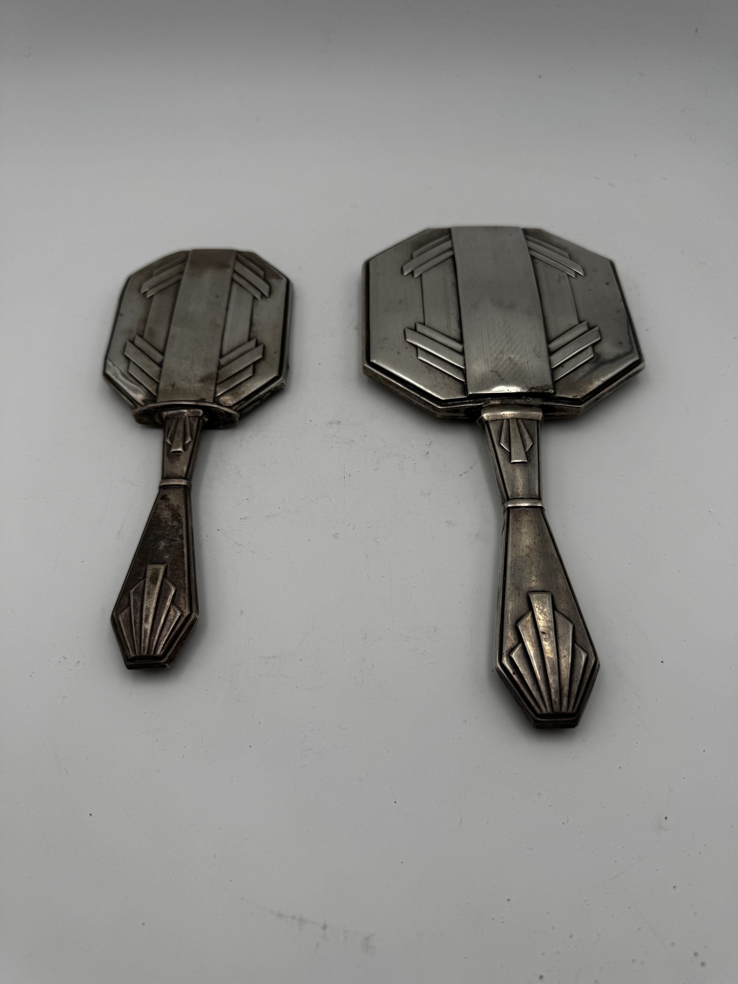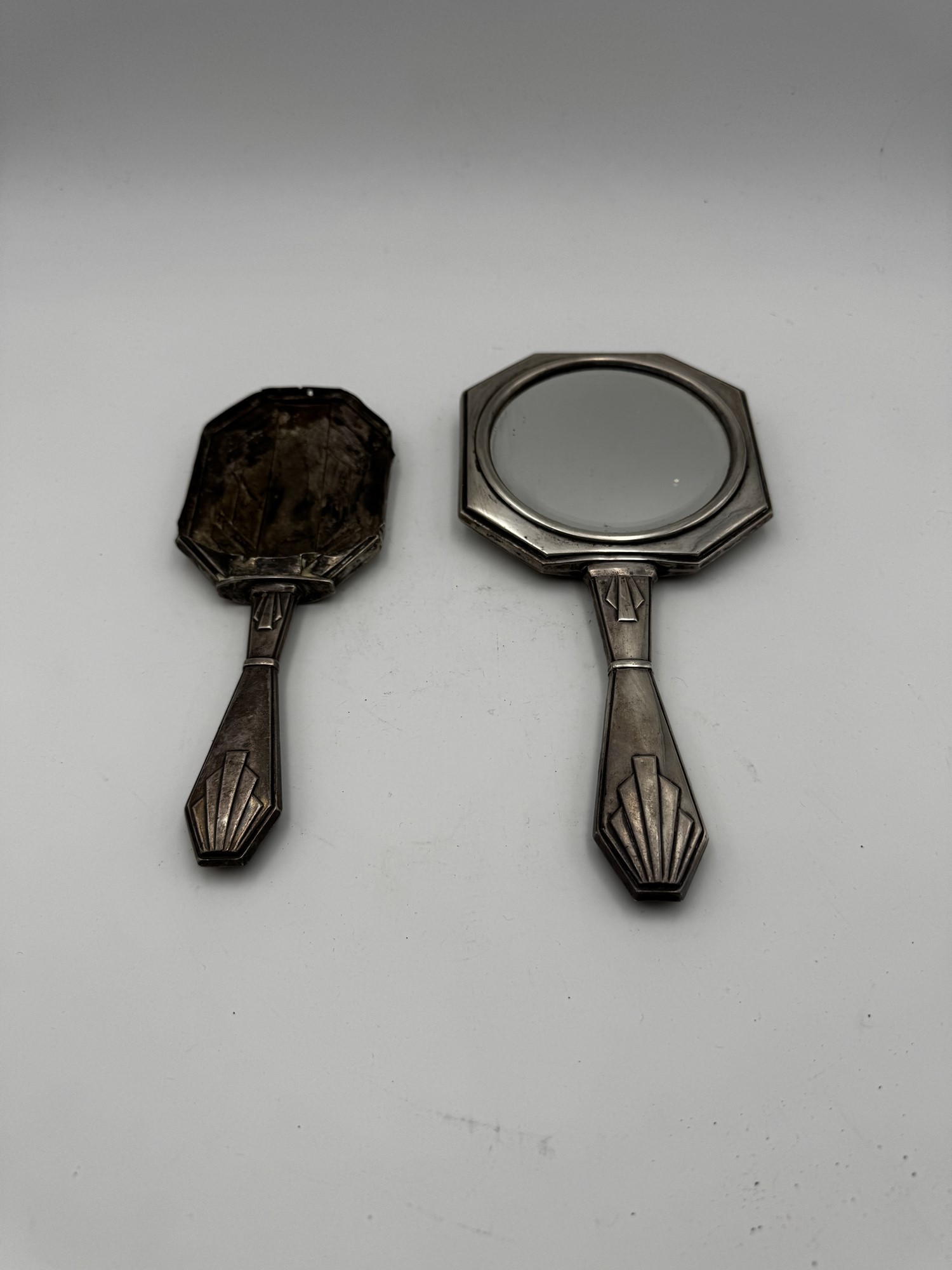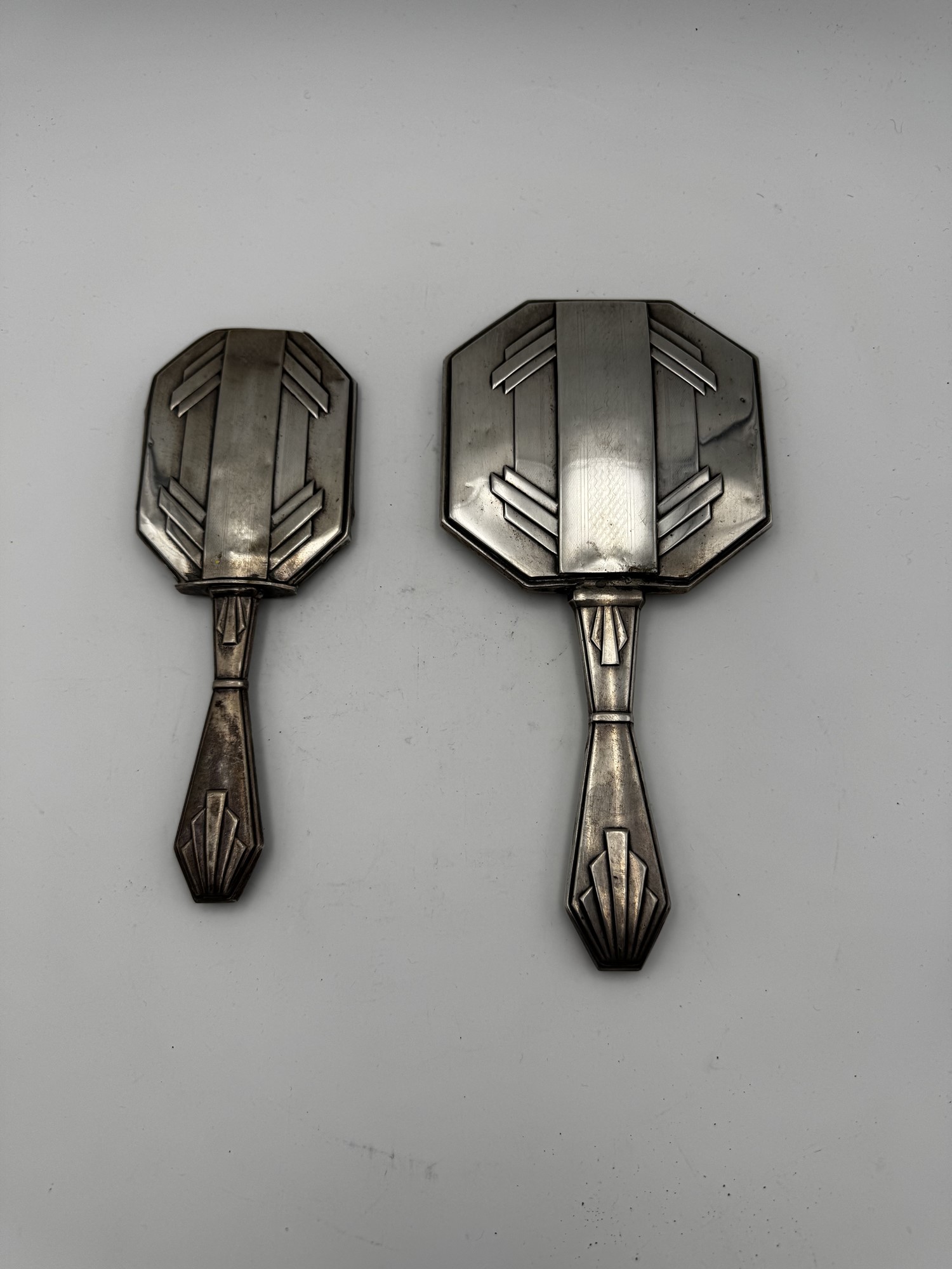 Lotto composto da due specchi in argento 800 in stile Art decò. 1930 circa, Italia. Cm 21; 23. Peso: 62 gr; 228 gr (compreso lo specchio).