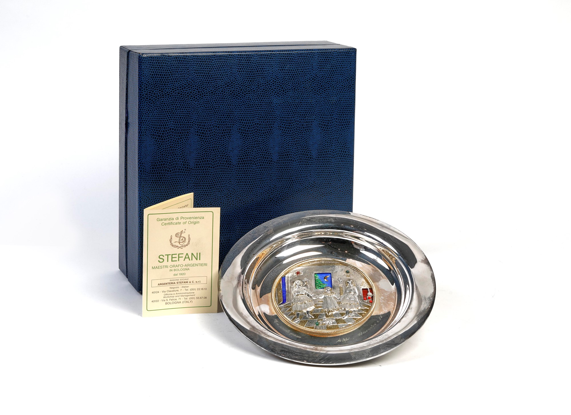 STEFANI MAESTRI ORAFO ARGENTIERI, XX secolo. Fondina dal titolo “Tre piccole grazie”. Argento 800, parti dorate con oro 24 Kt, smalti a gran fuoco, cabochon di pietre dure. Alla base reca firma A. Stefani. Reca sotto la base marchio, tecnica e punzoni. Accompagnato da garanzia di provenienza Stefani, maestri argentieri in Bologna. Peso 317 gr., diametro 22 cm. Reca numeri di tiratura 89/199.