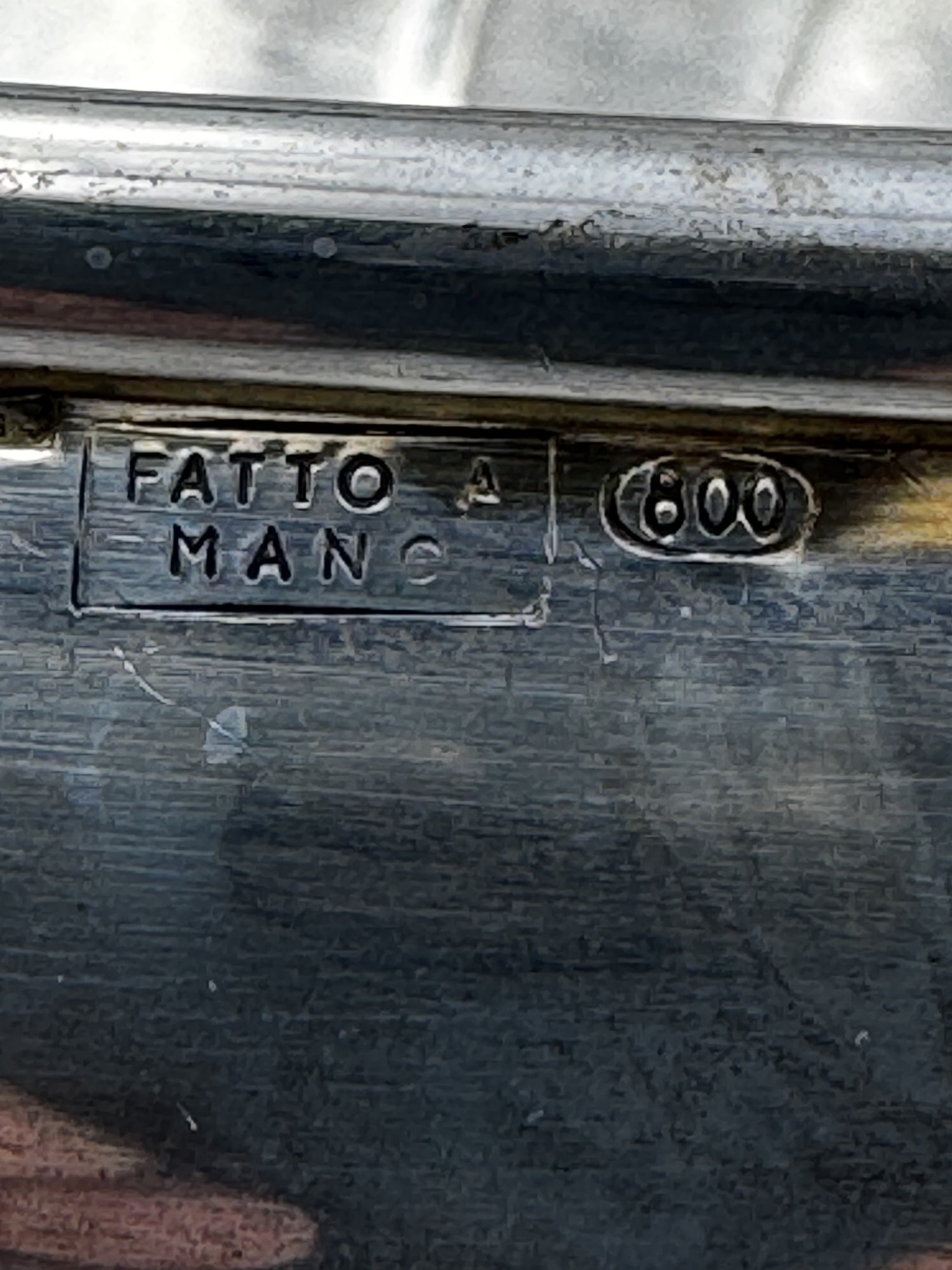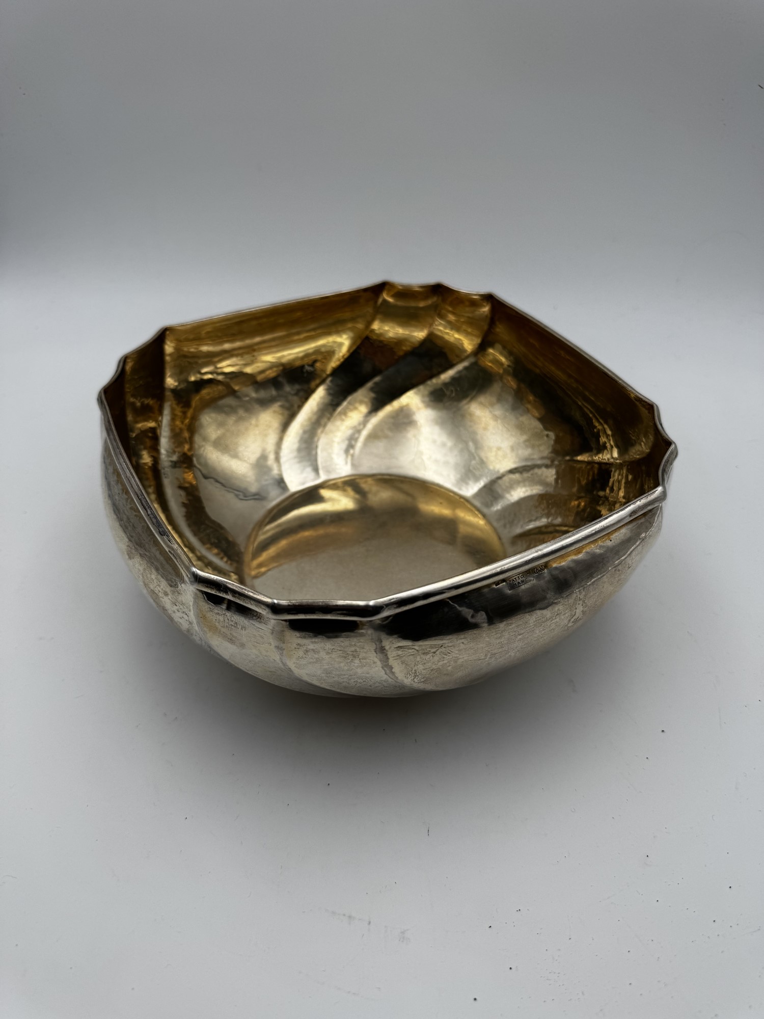 Ciotola in argento 800. Cm 9,5x23. Reca punzoni: 800, fatto a mano. Peso: 511 gr.