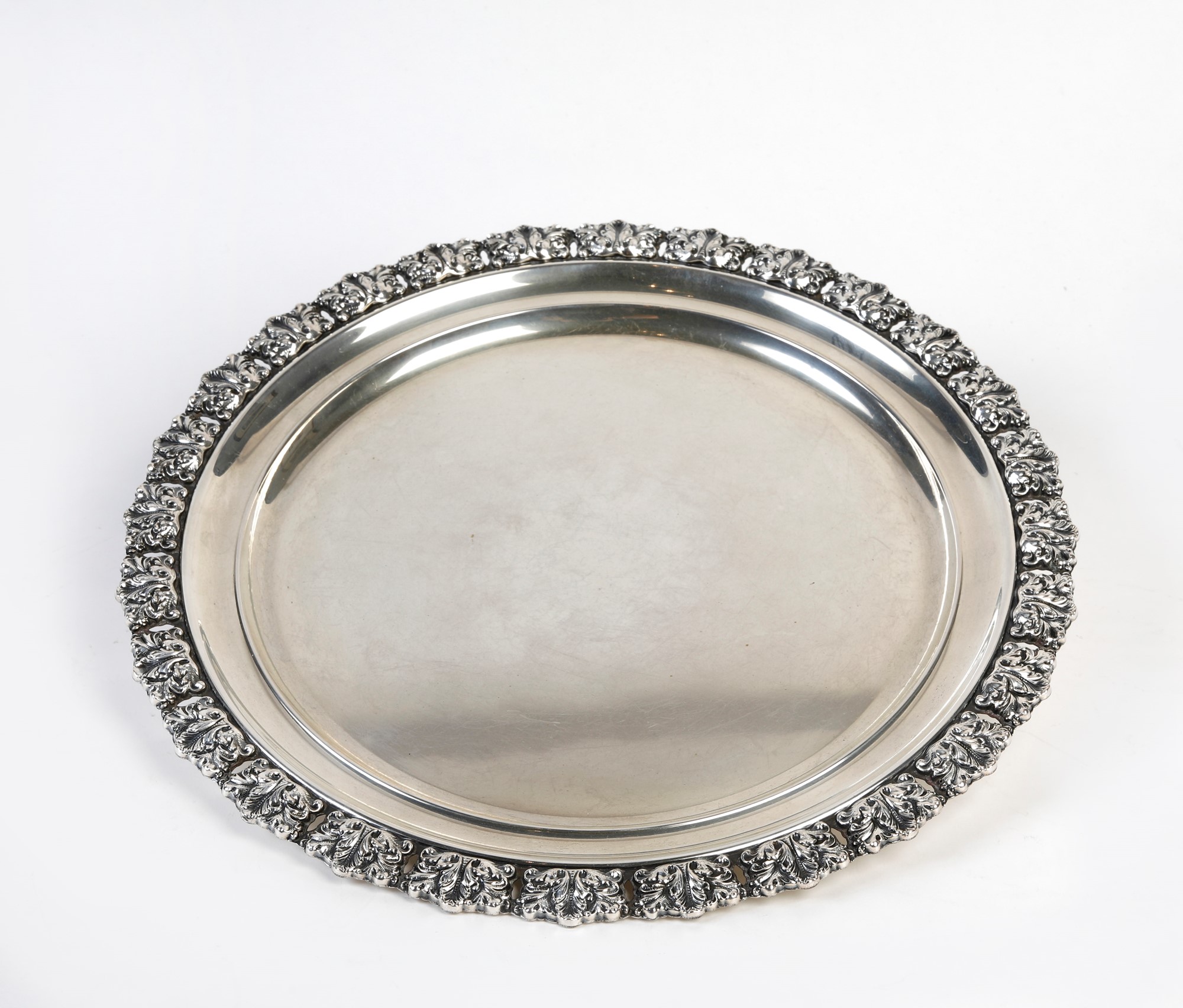 Firenze. Piatto in argento 800. Cm diametro 32. Reca punzoni 313 FI, 800. Peso 549 gr.