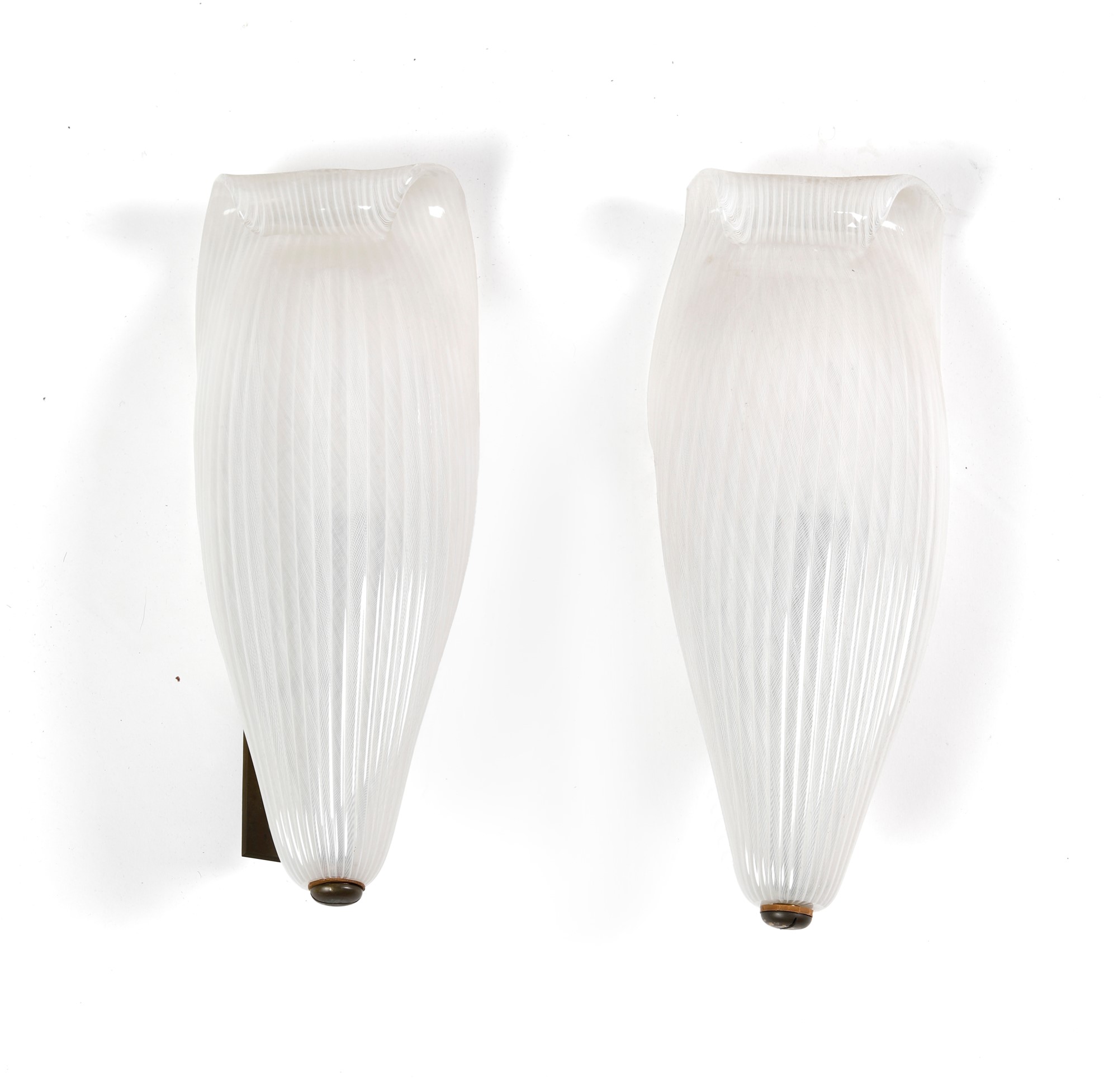VENINI Coppia di applique modello “5825” in vetro di Murano, serie Petali. Anni ’50. Prod. Venini, Italia. Cm 35x15x12.