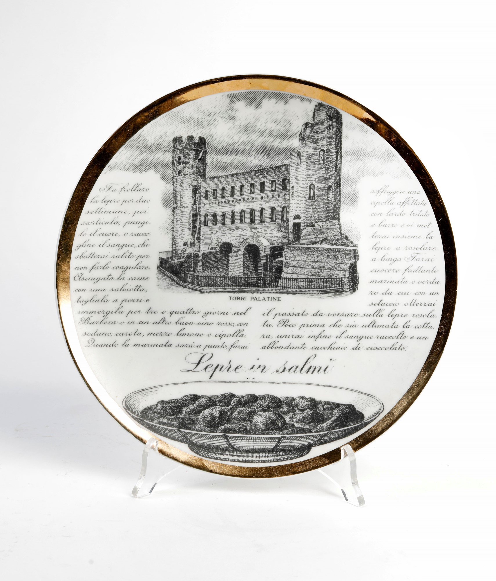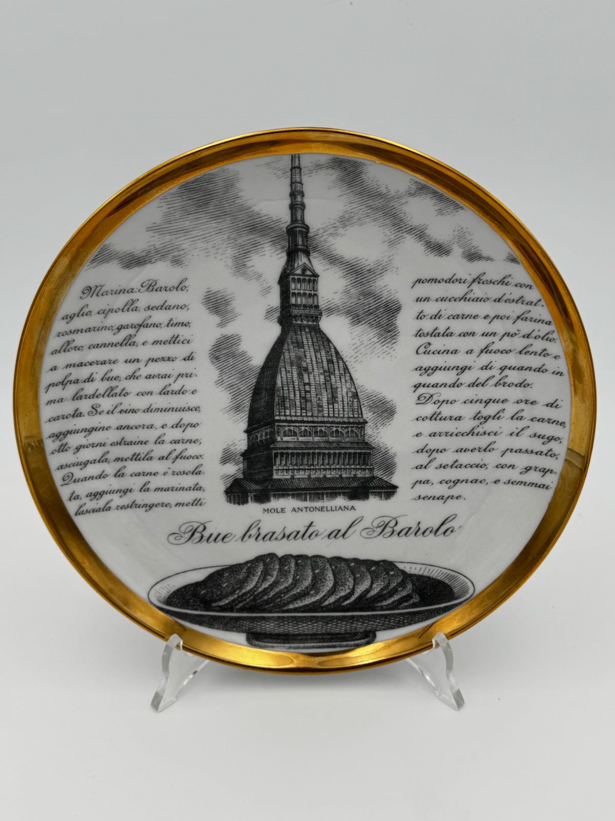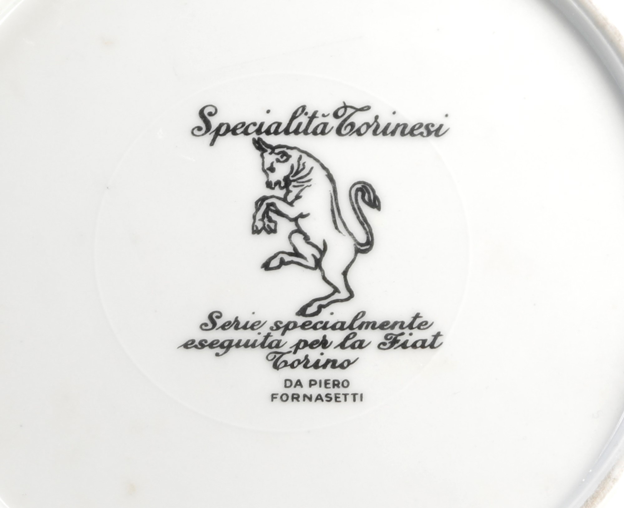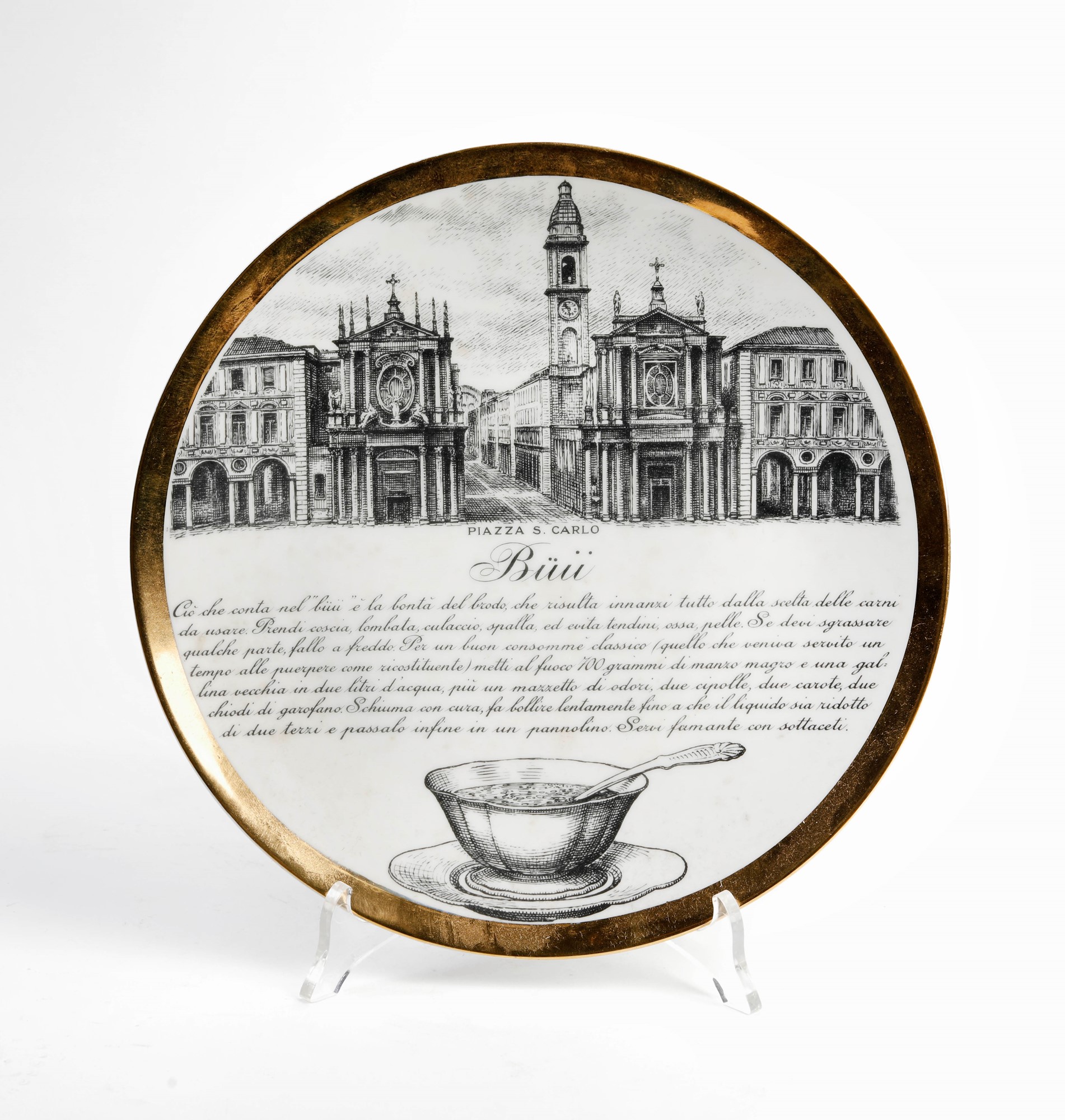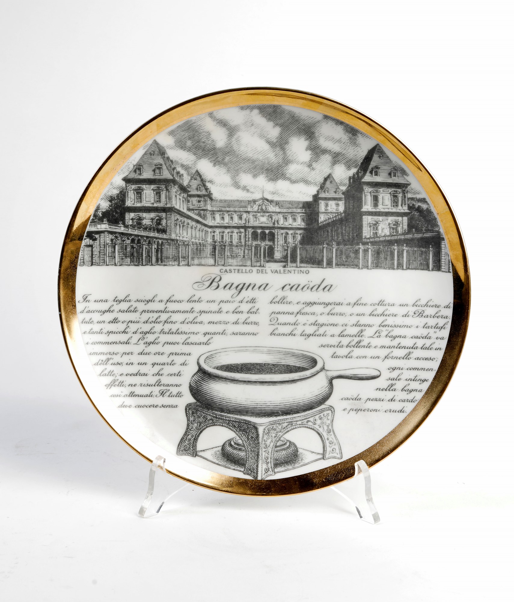 PIERO FORNASETTI (Milano 1913 – Milano 1988) Sei piatti della serie “Specialità piemontesi”. Anni ’60. Ceramica decorata a serigrafia. Cm 24 diam. Al retro marcate: Fornasetti, Milano, Made in Italy e simbolo grafico numerato.