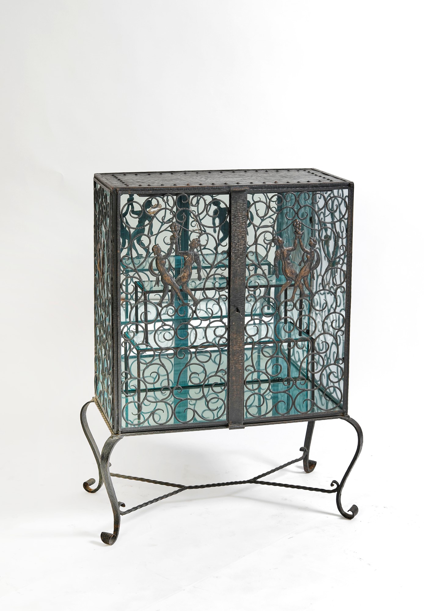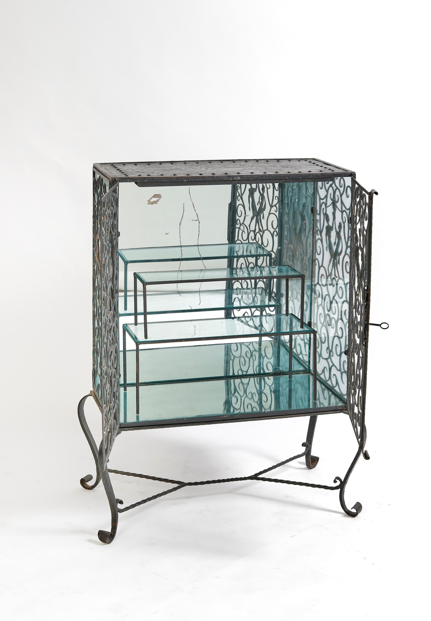 Vetrinetta in ferro lavorato a volute e vetro a specchi. XX secolo. Cm 103x80x42.