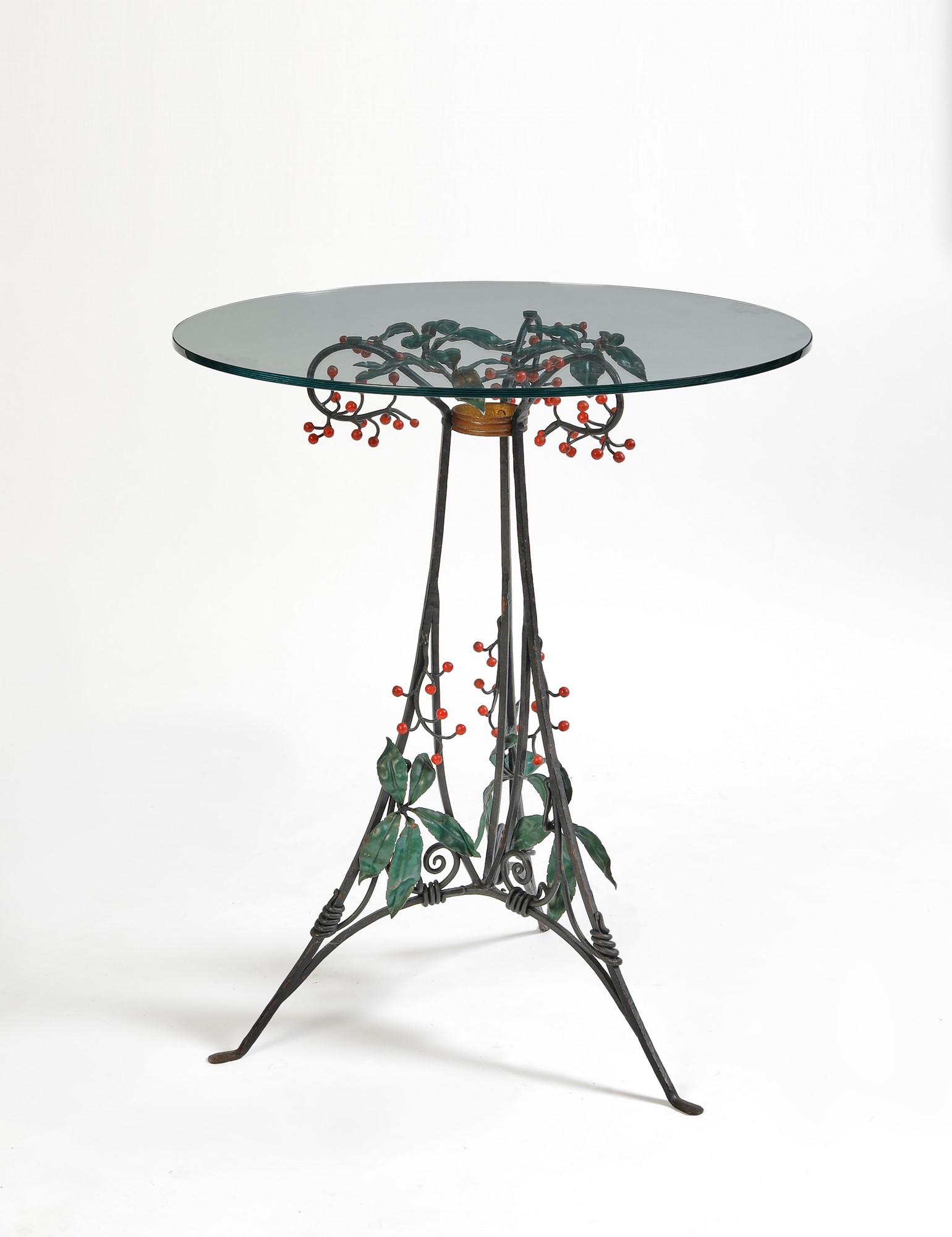 Tavolino in ferro battuto a foggia di foglie e bacche. Piano in vetro smussato. 1930 circa. Cm 81x40.