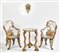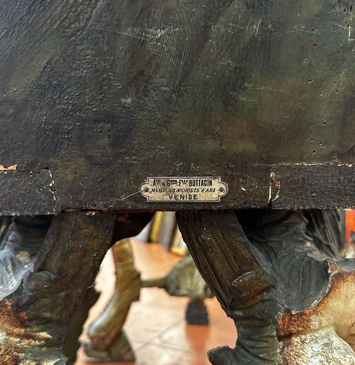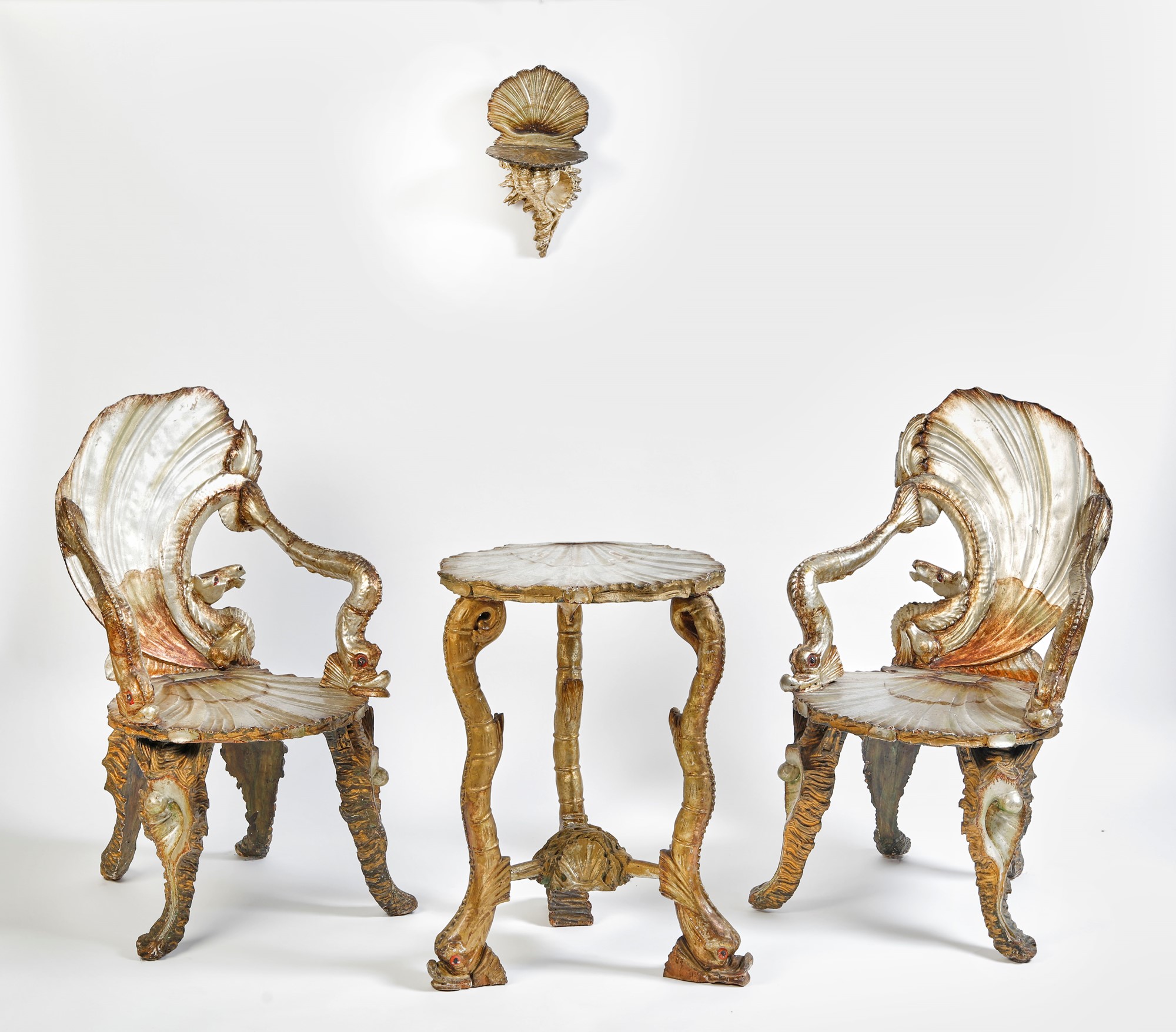Salottino composto da due sedie, un tavolino circolare e una mensola da parete, esemplare raro e scenografico ispirato al repertorio fantastico dei cosiddetti mobili di grotta, stile decorativo in voga tra la fine del XIX e l’inizio del XX secolo, intriso di gusto marino, esotismo e immaginario teatrale. Prod. Fratelli Bottacini, Venezia, 1900 ca. Le sedute, interamente scolpite in legno e laccate con effetti madreperlati e dorature, presentano schienali e sedute a forma di grande conchiglia, con braccioli animati da cavallucci marini e creature fantastiche. Le gambe sono scolpite come zampe ricurve, arricchite da dettagli marini e tentacolari. Il tavolino, con piano sempre a forma di conchiglia, è sostenuto da gambe scolpite come delfini intrecciati, mentre la mensola murale si sviluppa attorno a una grande conchiglia sommitale e motivi di corallo. Al retro una seduta reca etichetta Fratelli Bottacin, Meubles & Objets d'Art, Venise. Cm h (sedie) 97; h (tavolino) 72.