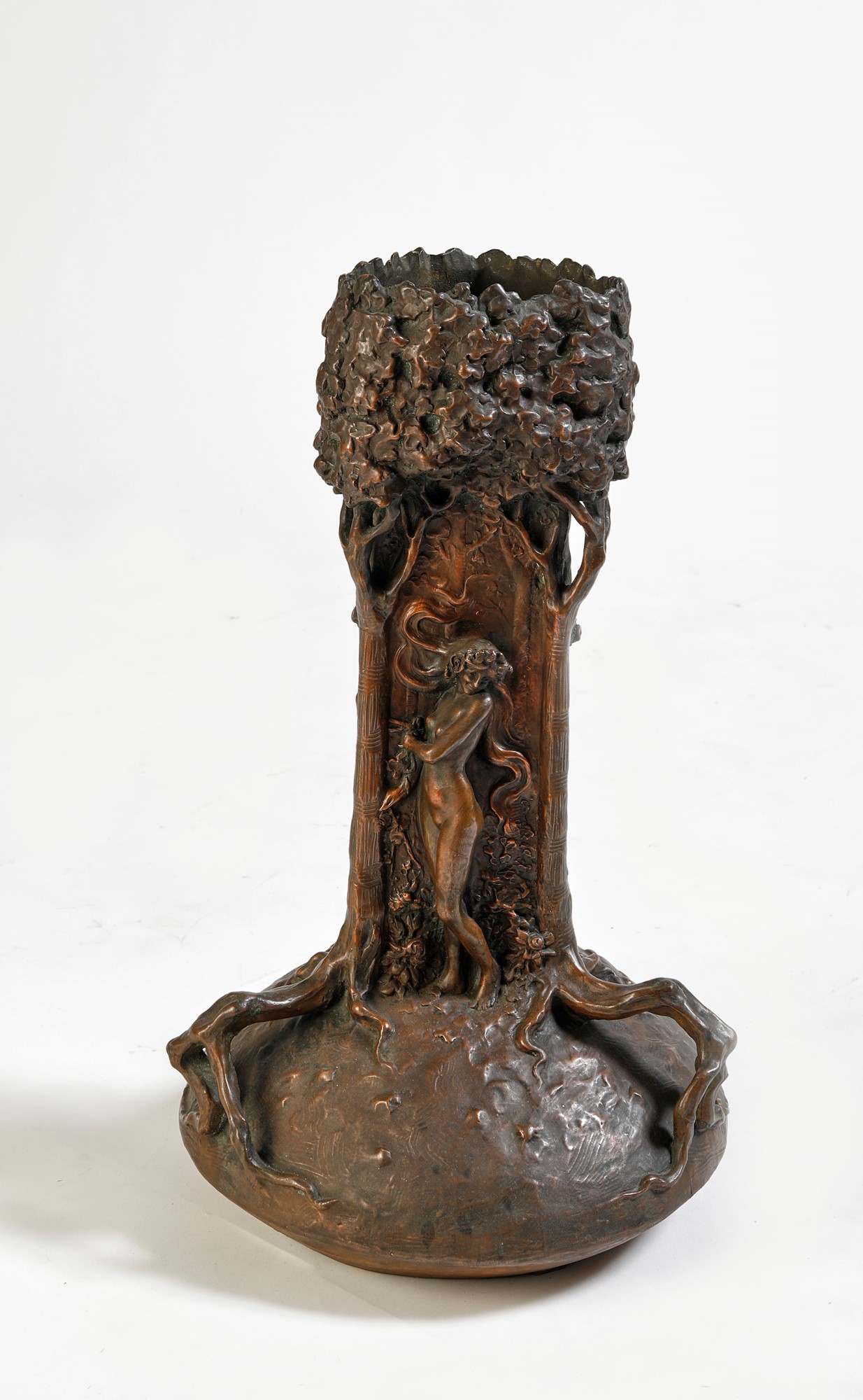 ACHILLE TAMBURLINI, RAFFAELE CARBONARO Grande vaso in terracotta galvanizzata in rame. 1900 ca. Cm 57x33⌀. Opera firmata alla base A.T.R.C, Venezia. Opera presentata alla Biennale 1901.