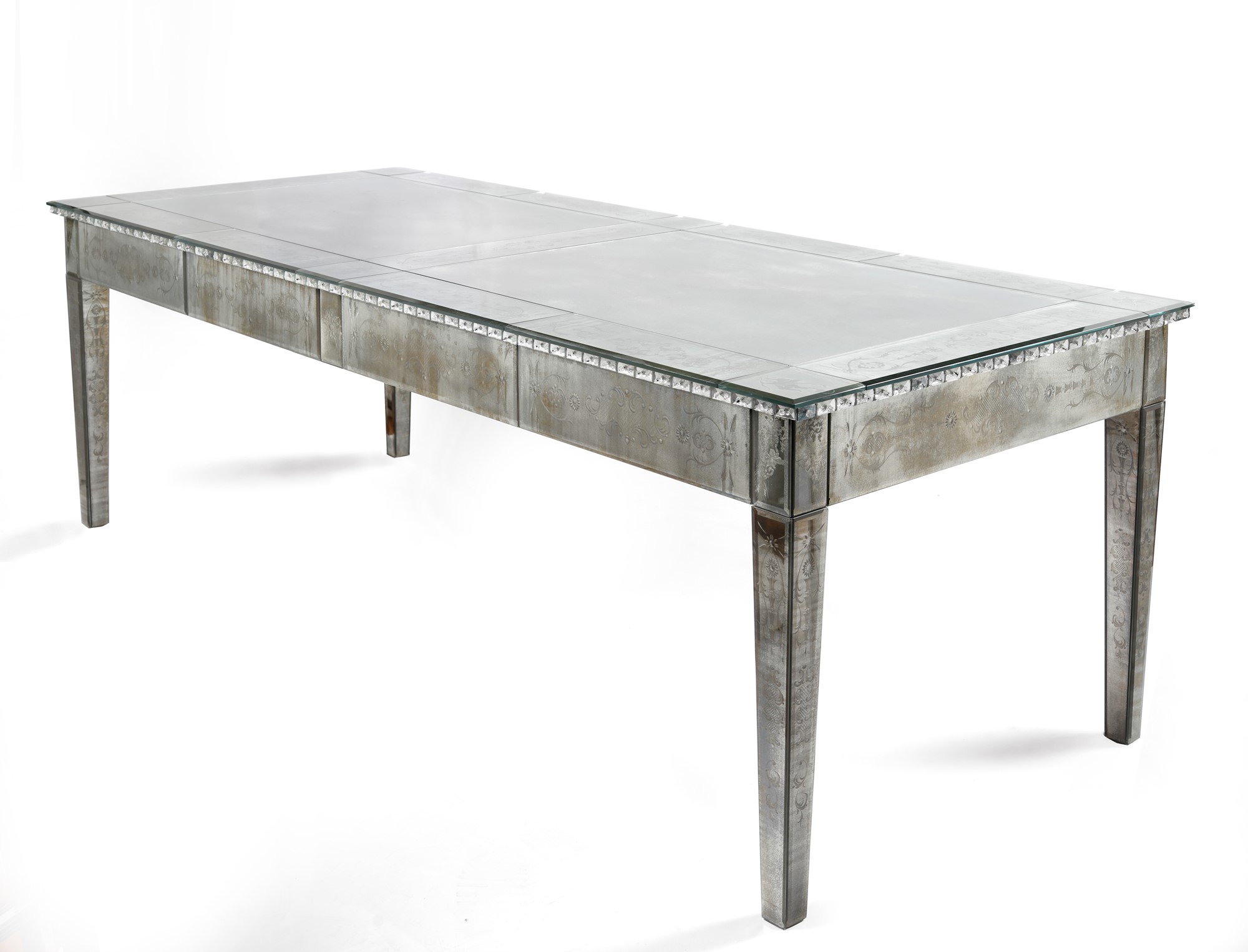 Tavolo Sant'Elena in vetro di Murano, elegante riproduzione di tavolo del Settecento veneziano, finemente inciso con mole a rame e arenaria. 1900 circa. Cm 80x250x105.