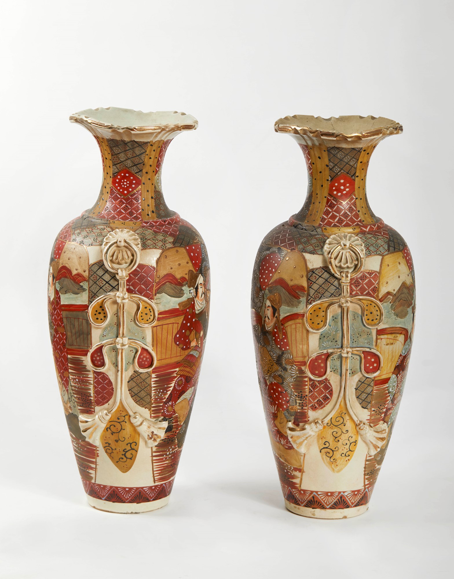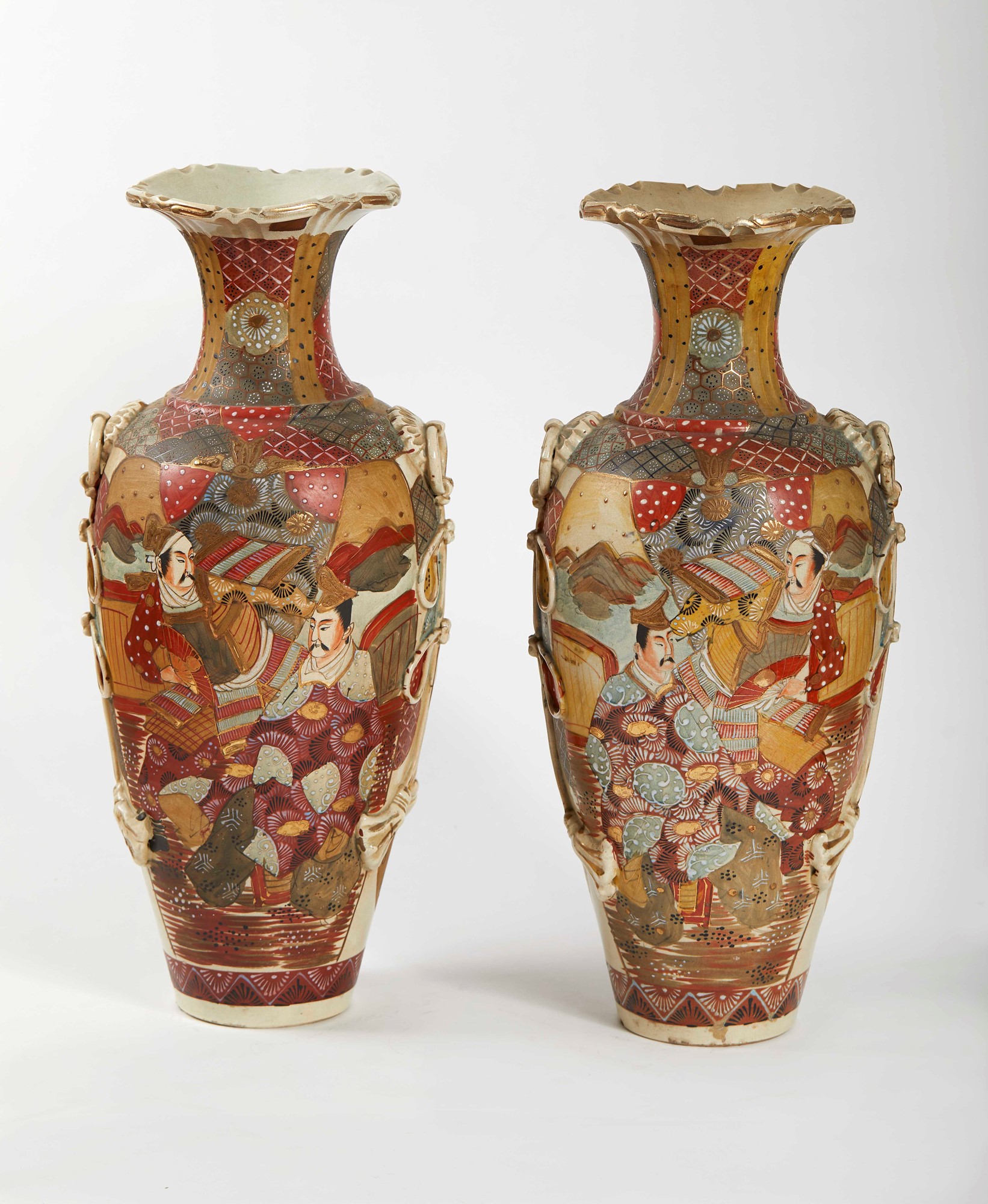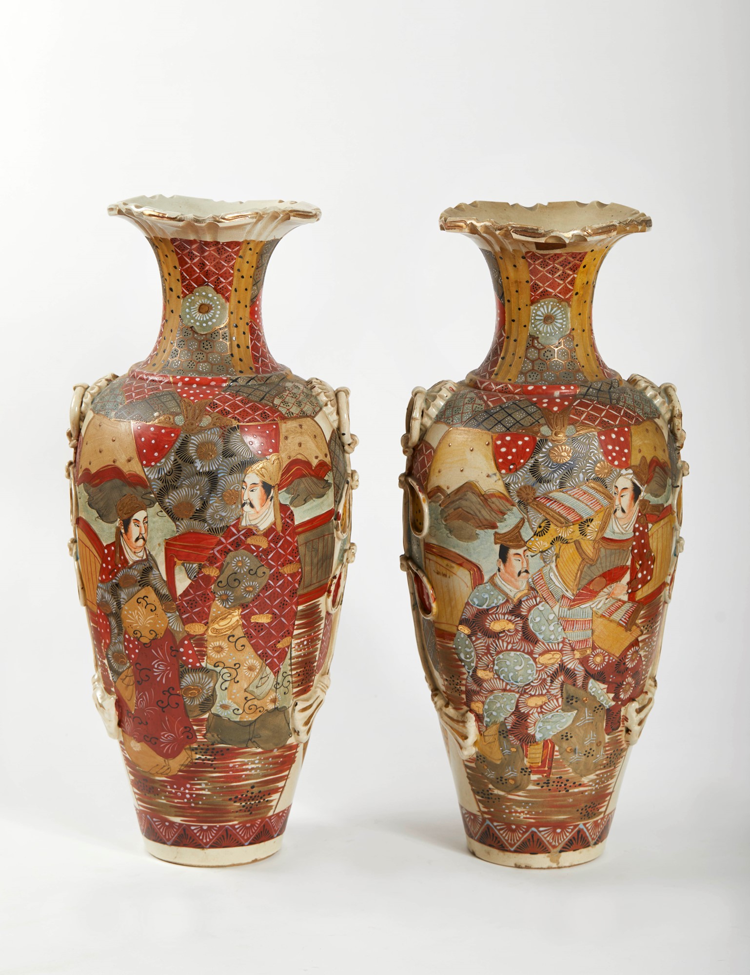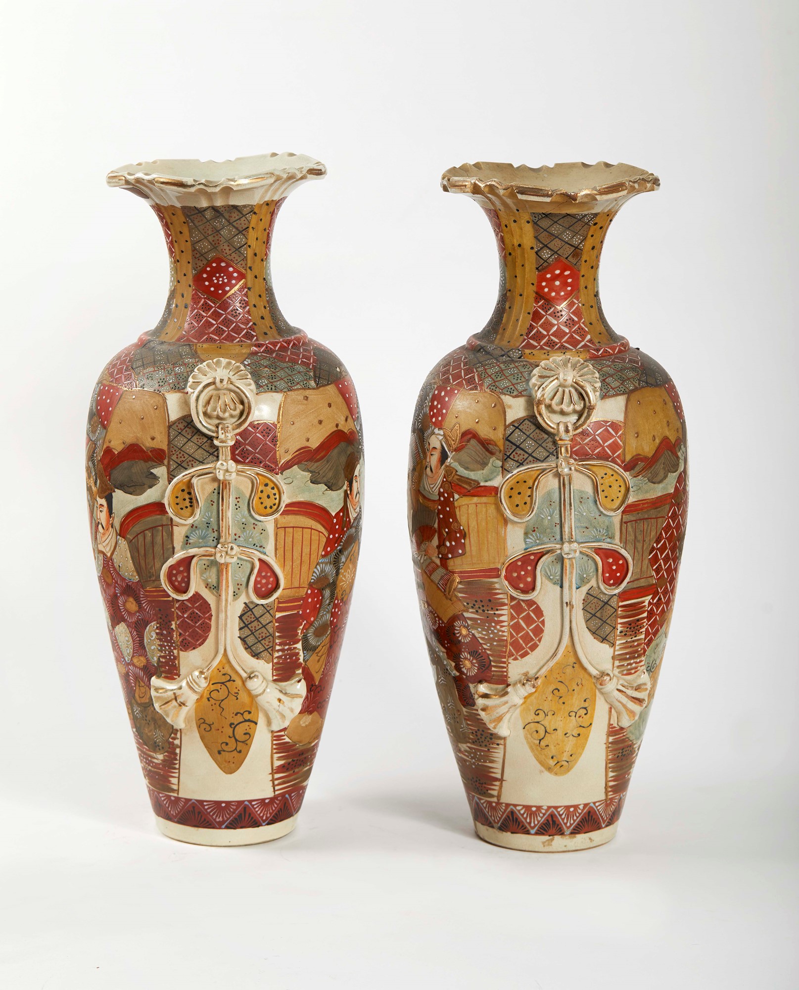 Coppia di vasi giapponesi in ceramica dipinta. Fine del XIX - inizi del XX secolo. Cadauno cm 60x20.