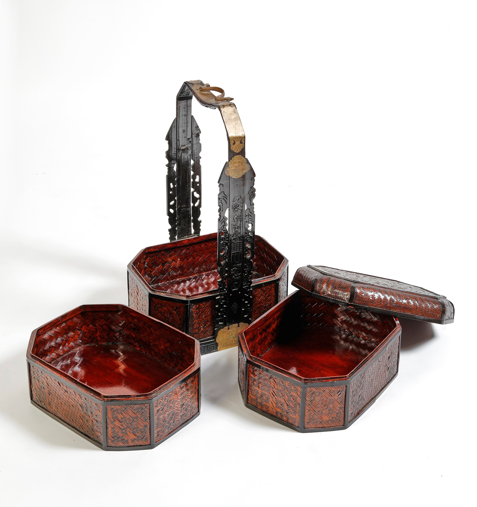 Baule nuziale cinese a canne intrecciate. Apribile in tre scomparti. Maniglie e ferramenta in ottone con testa di drago in metallo. 1900 circa. Cm 64,5x39,5x33.