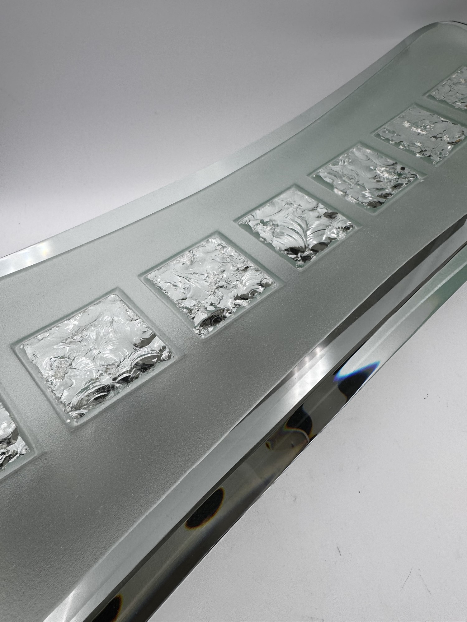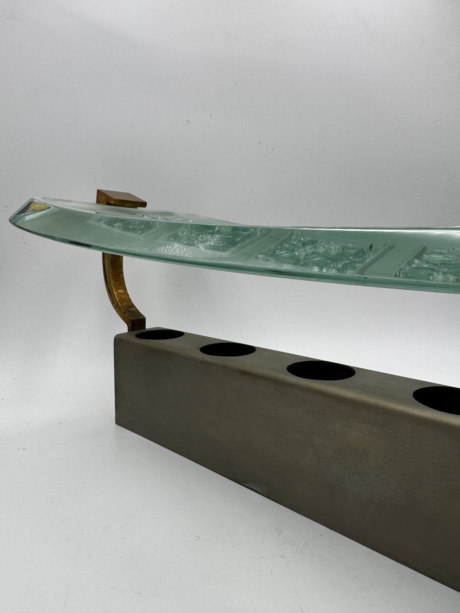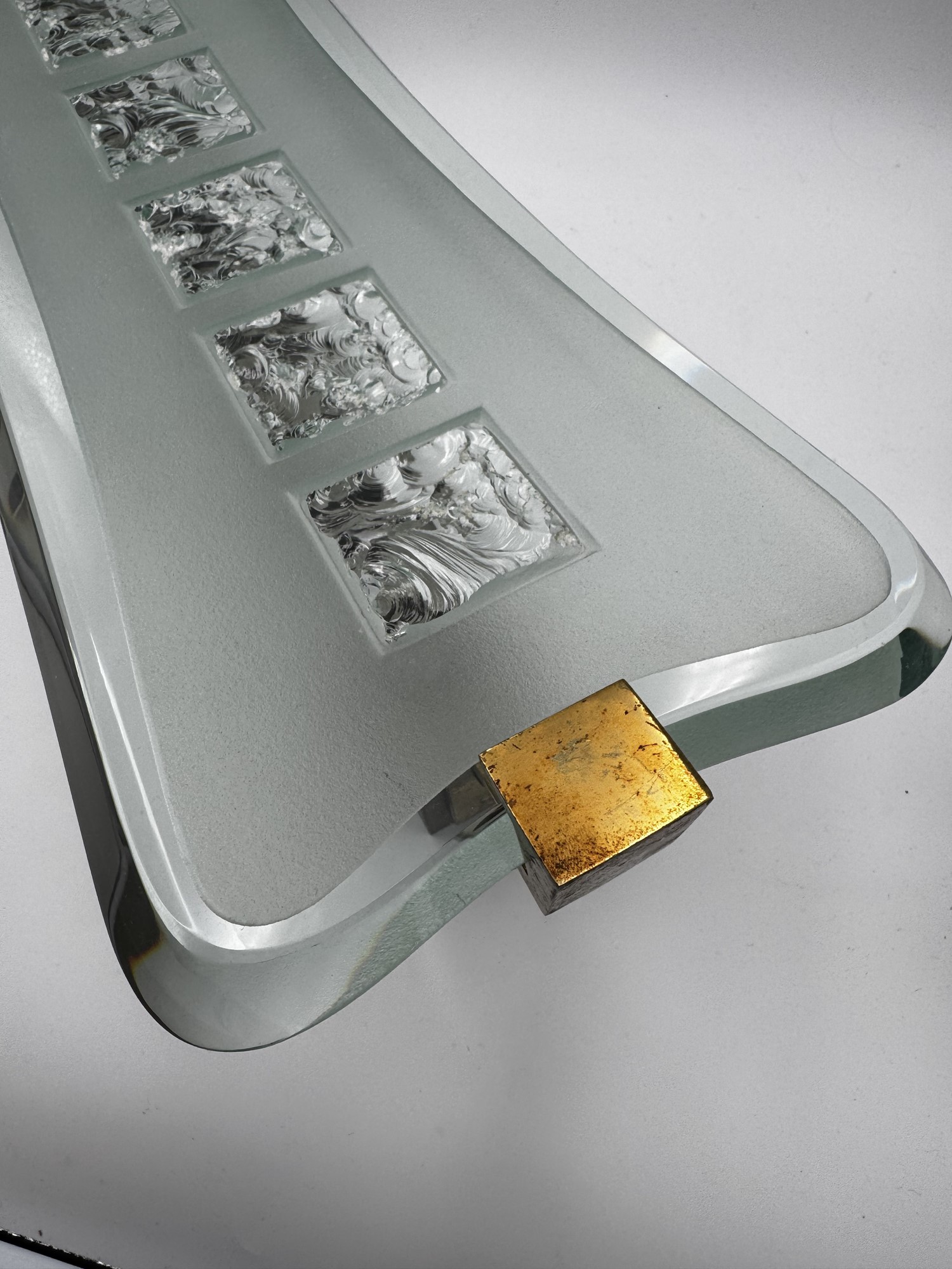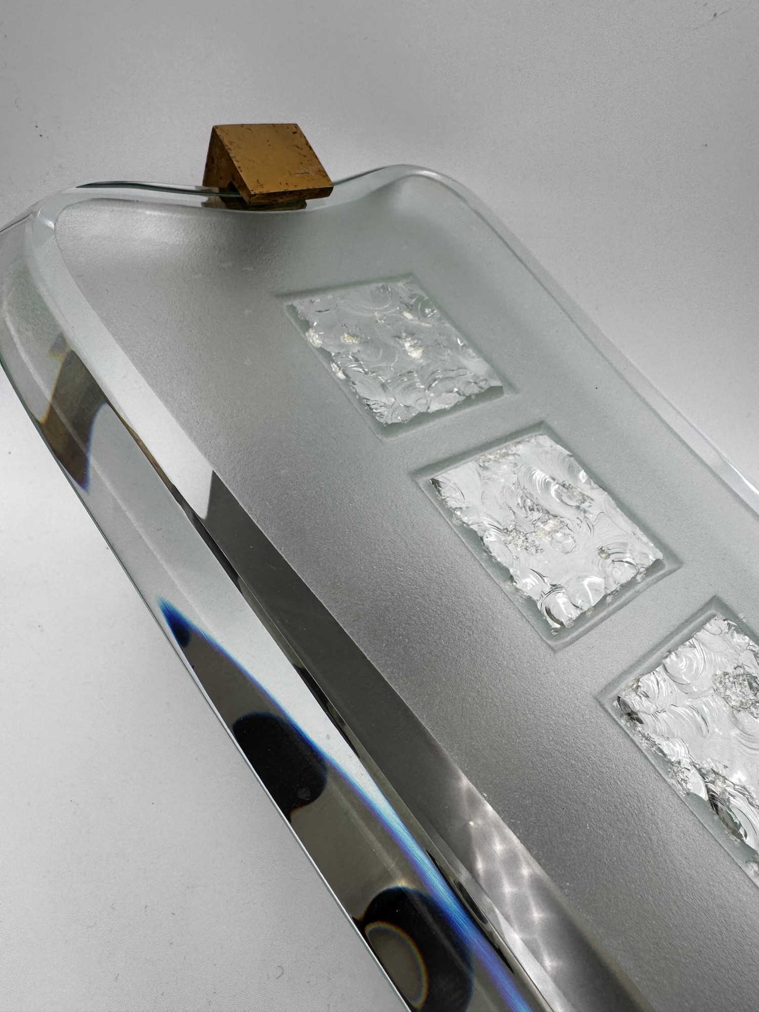 MAX INGRAND (Bressuire 1908 - Parigi 1969) Applique "1568" in vetro, metallo e ottone. Diffusori in vetro curvo e spesso, parzialmente satinato con 5 sezioni cesellate in ciascuno. 1956. Prod. Fontana Arte, Italia. Cm 19x60x22.