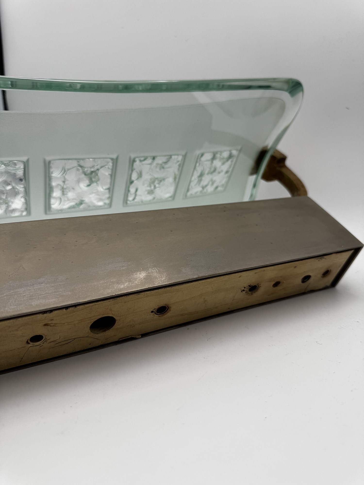 L'applique esemplifica la raffinata eleganza del design italiano degli anni Cinquanta. Realizzata in vetro curvo parzialmente smerigliato e cesellato da Duilio Bernabé, metallo cromato e ottone, mostra la meticolosa lavorazione artigianale per cui Fontana Arte è rinomata.