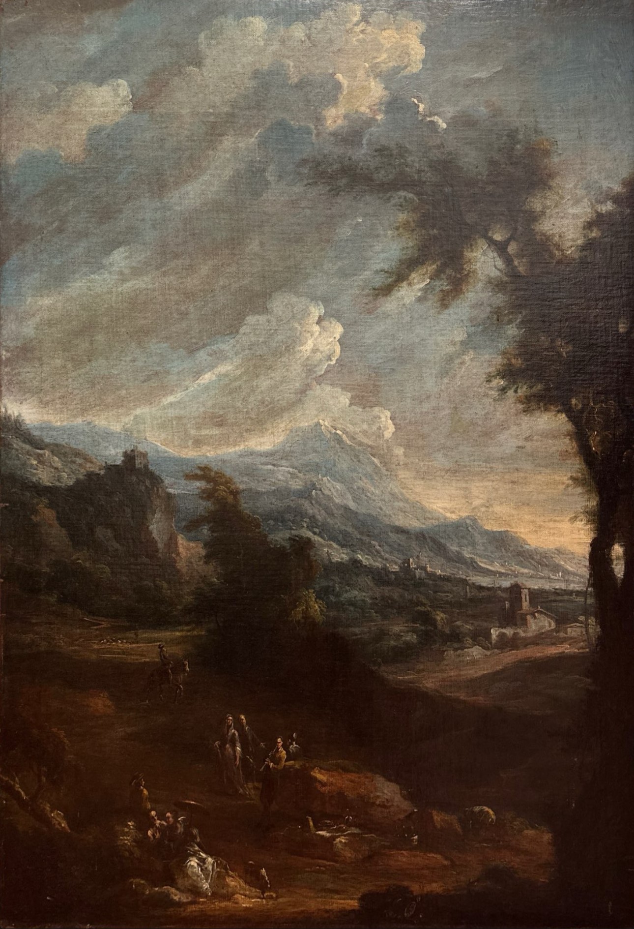 Pittore anonimo del XVII secolo. "Paesaggio con figure". Olio su tela. Cm 125x93,5.