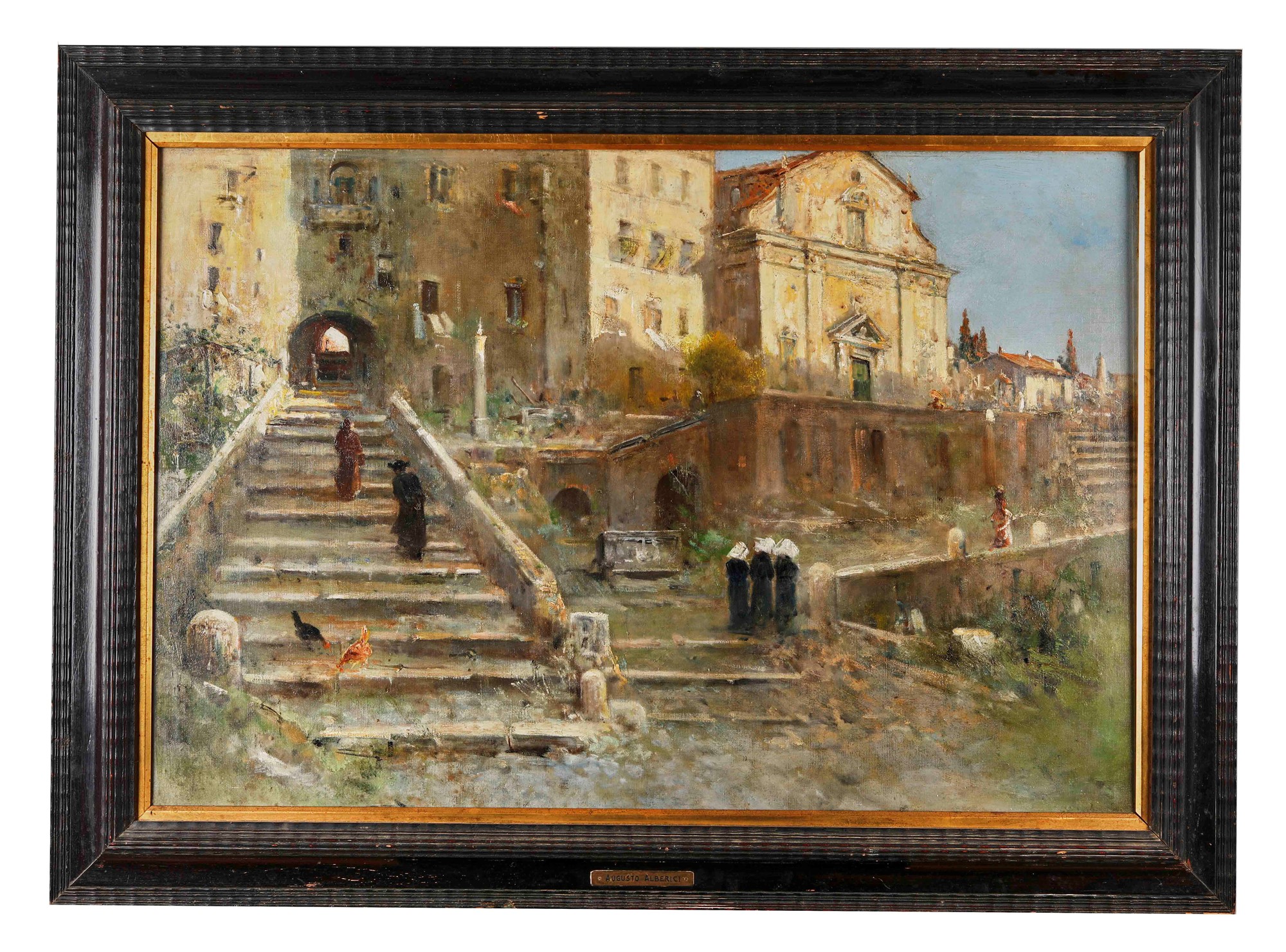 Augusto Alberici (Roma, 1846 - 1922, ) "Scorcio urbano" Cm 68,5x100