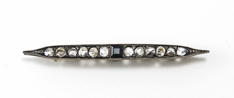 SPILLA FERMACRAVATTE IN ORO GIALLO, ARGENTO, ZAFFIRO E DIAMANTI realizzata a barretta con al centro zaffiro carré e diamanti taglio a rosa laterali gr 7,9 GOLD, SILVER SAPPHIRE AND DIAMONDS TIE CLIP