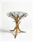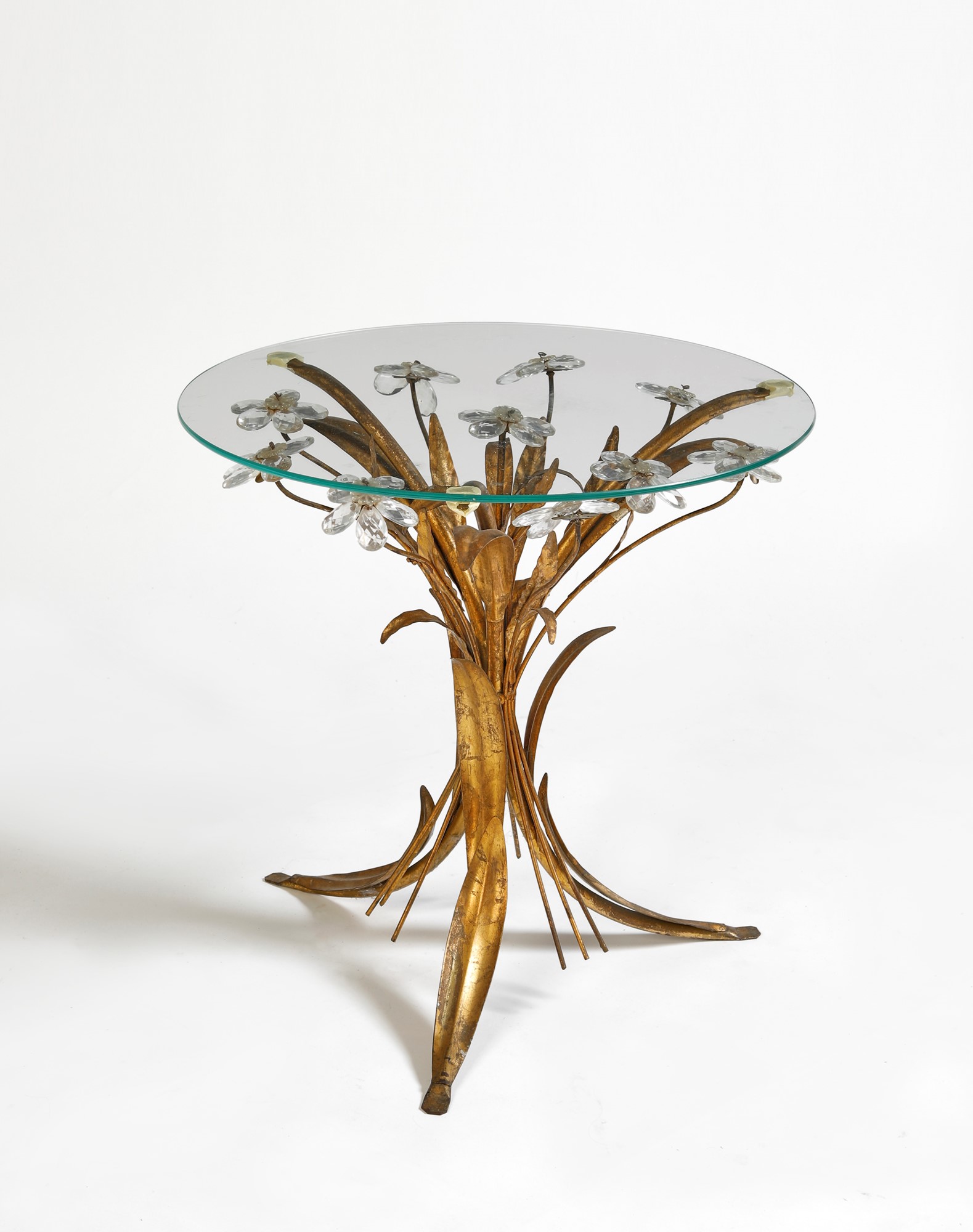 Tavolino in ferro battuto dorato, con applicazioni di fiori in vetro e piano in vetro. XX secolo. Cm 49x50.