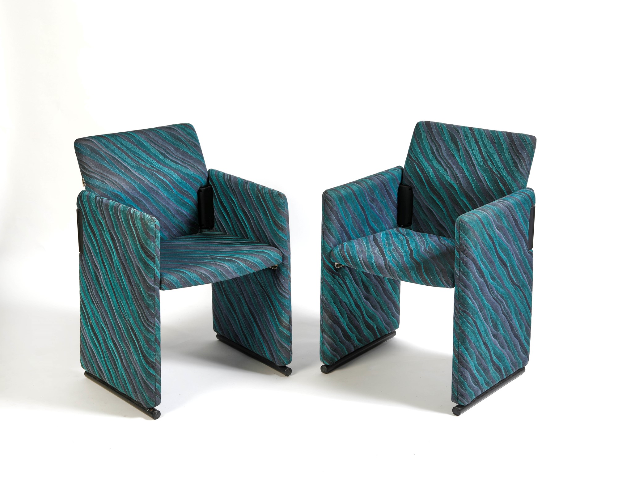 FRANCO BUZZATI ED ENRICO ROCCHI Coppia di poltrone modello Roota in tessuto colorato. 1980 circa. Prod. Deko, Italia. Rispettivamente di cm: 80x55x50.