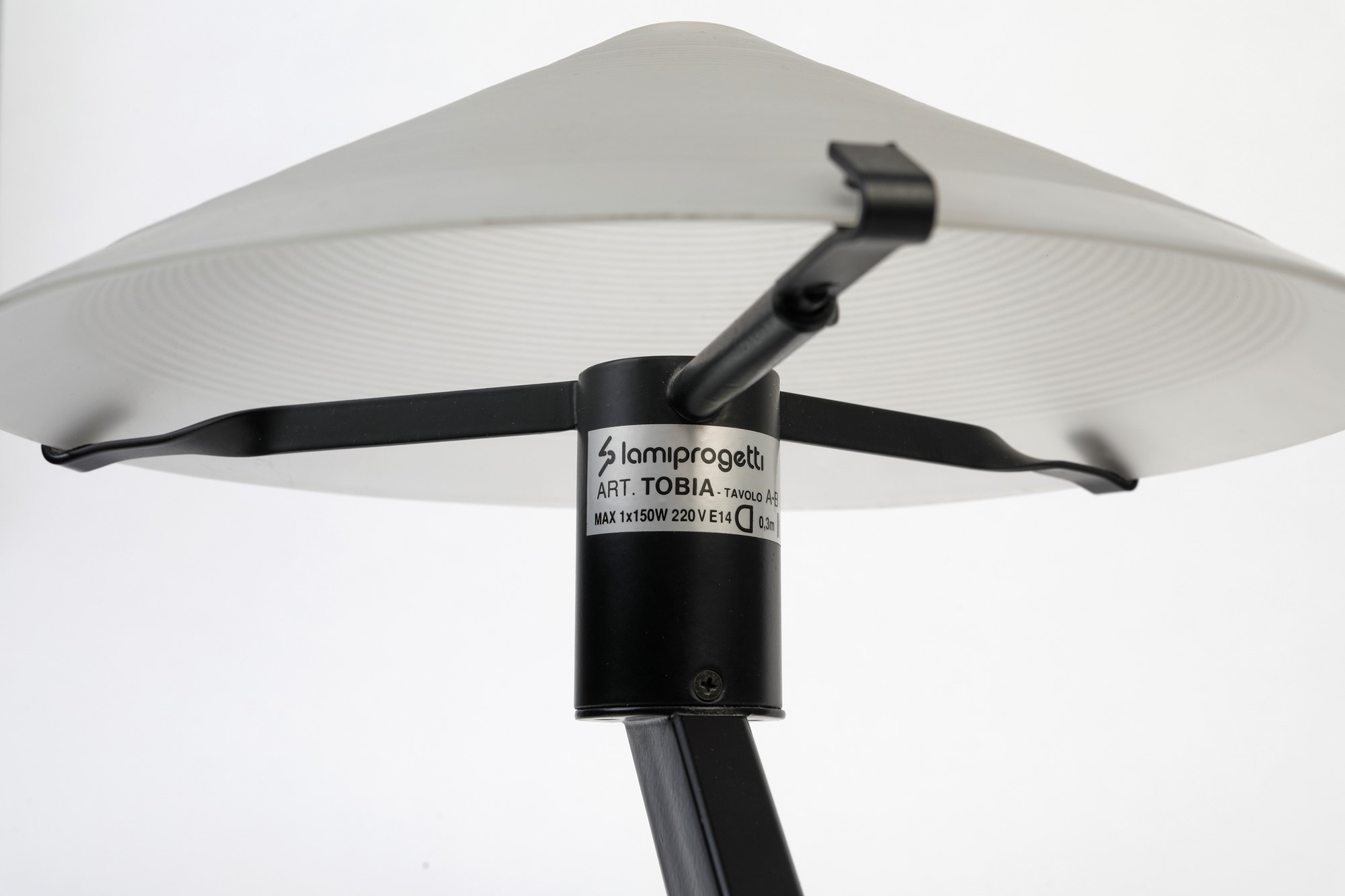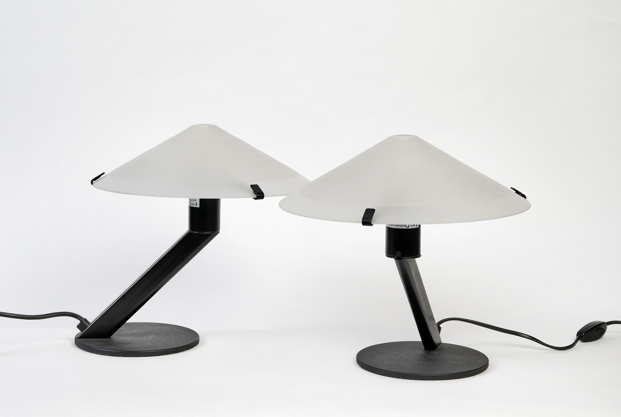 LAMIPROGETTI Coppia di lampade modello Tobia. 1980. Lampade da tavolo in metallo verniciato e vetro sabbiato. Prod. Lamiprogetti, Italia. Cm 20x30. Recano etichetta Lamiprogetti.