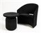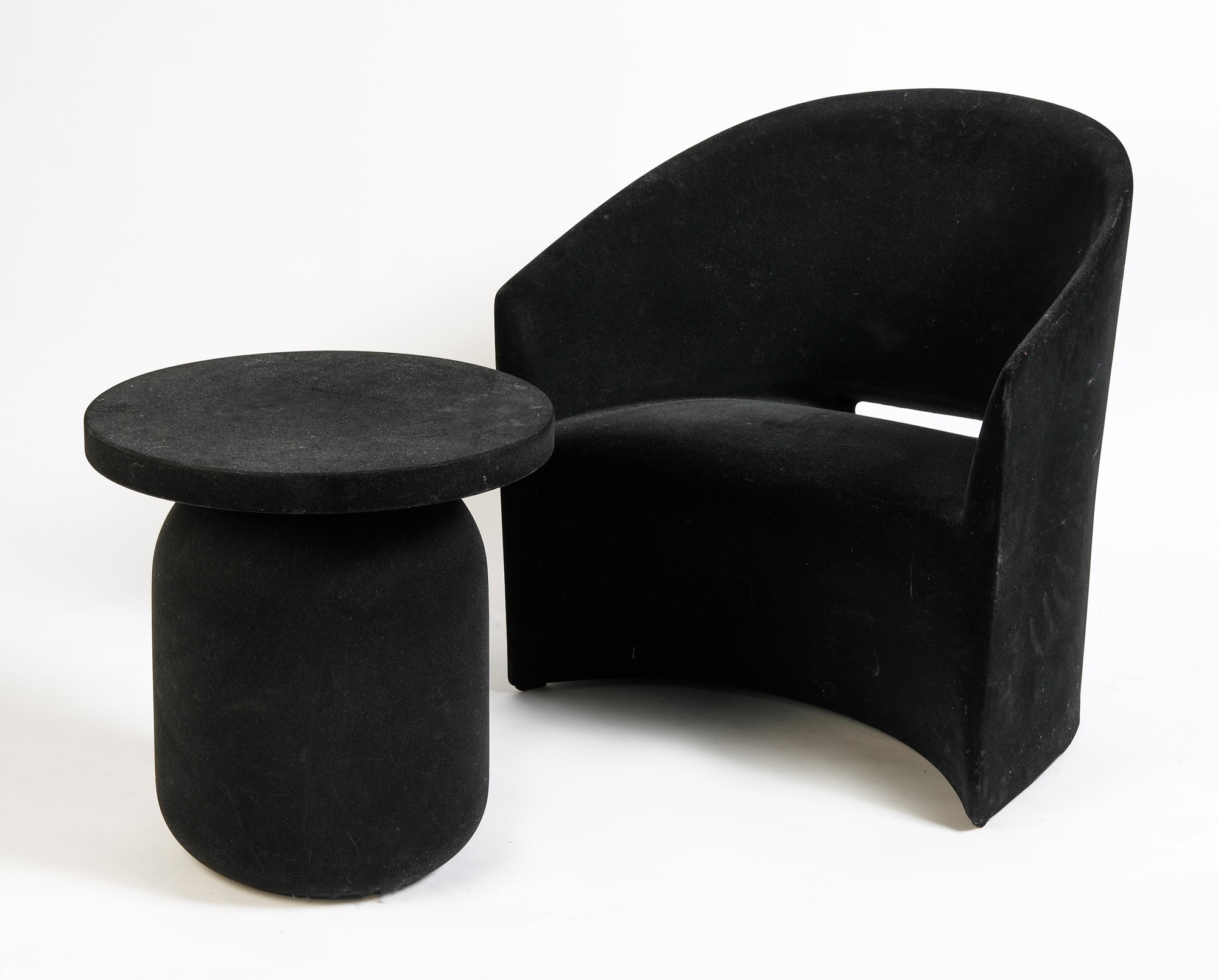 Salottino da esterno composto da poltrona e tavolino in velluto nero. XXI secolo. Prod. Serralunga, Italia. Cm (sedia) 75x68x63; (tavolino) 51x52.