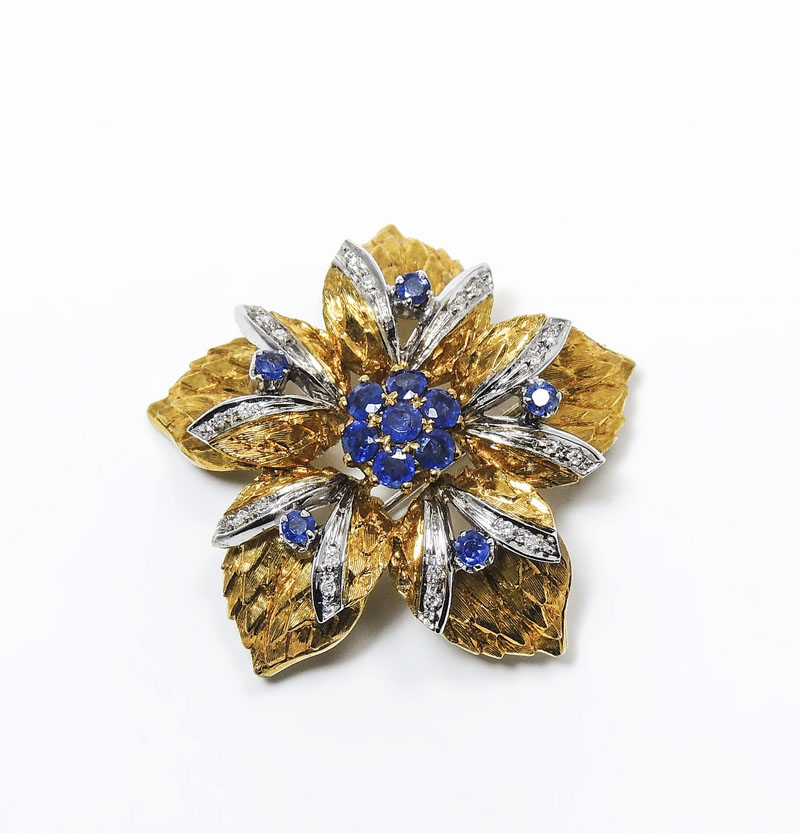 SPILLA IN ORO GIALLO, ORO BIANCO, ZAFFIRI E DIAMANTI TAGLIO A ROSA realizzata come un fiore gr 17,1 GOLD, SAPPHIRE AND DIAMONDS BROOCH