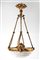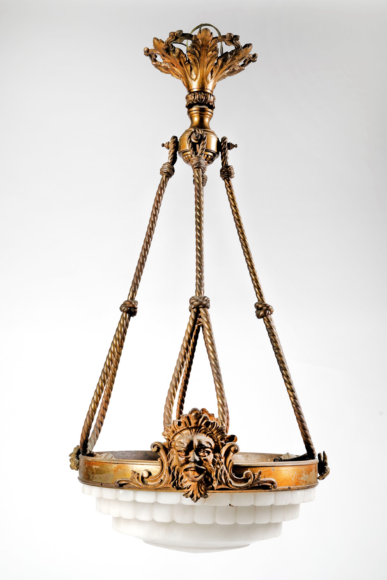 Lampadario in ottone con decorazioni a maschere. Elettrificato. Inizi del XX secolo, Bologna. Cm 77x36.