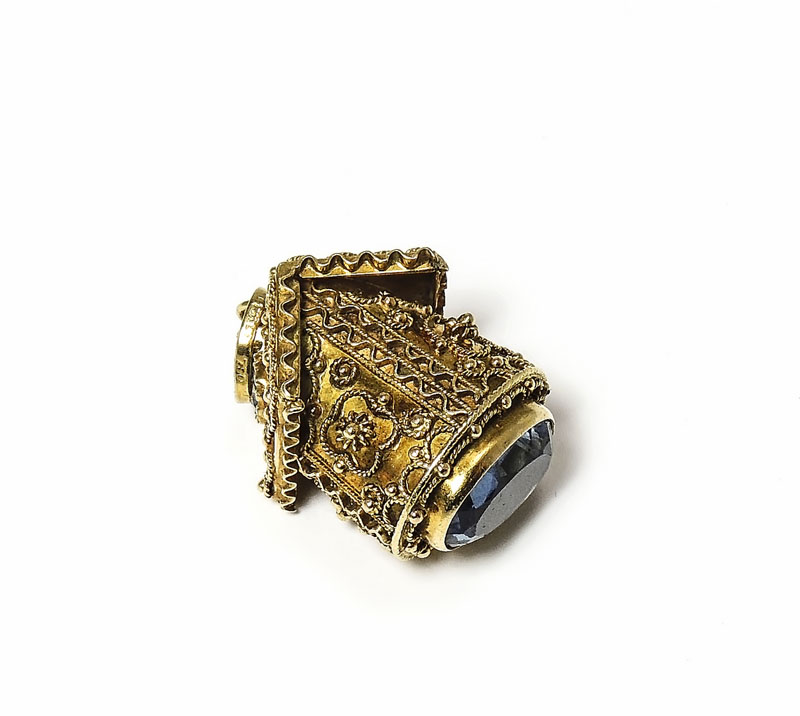 PENDENTE IN ORO GIALLO E TOPAZIO con decori in filigrana e topazio azzurro...