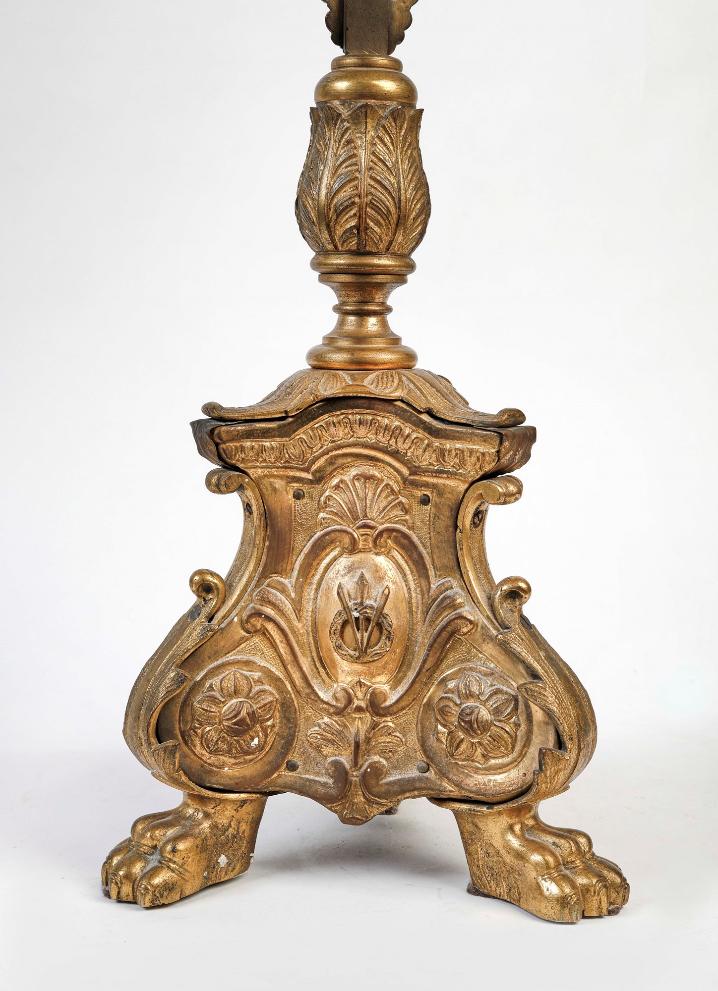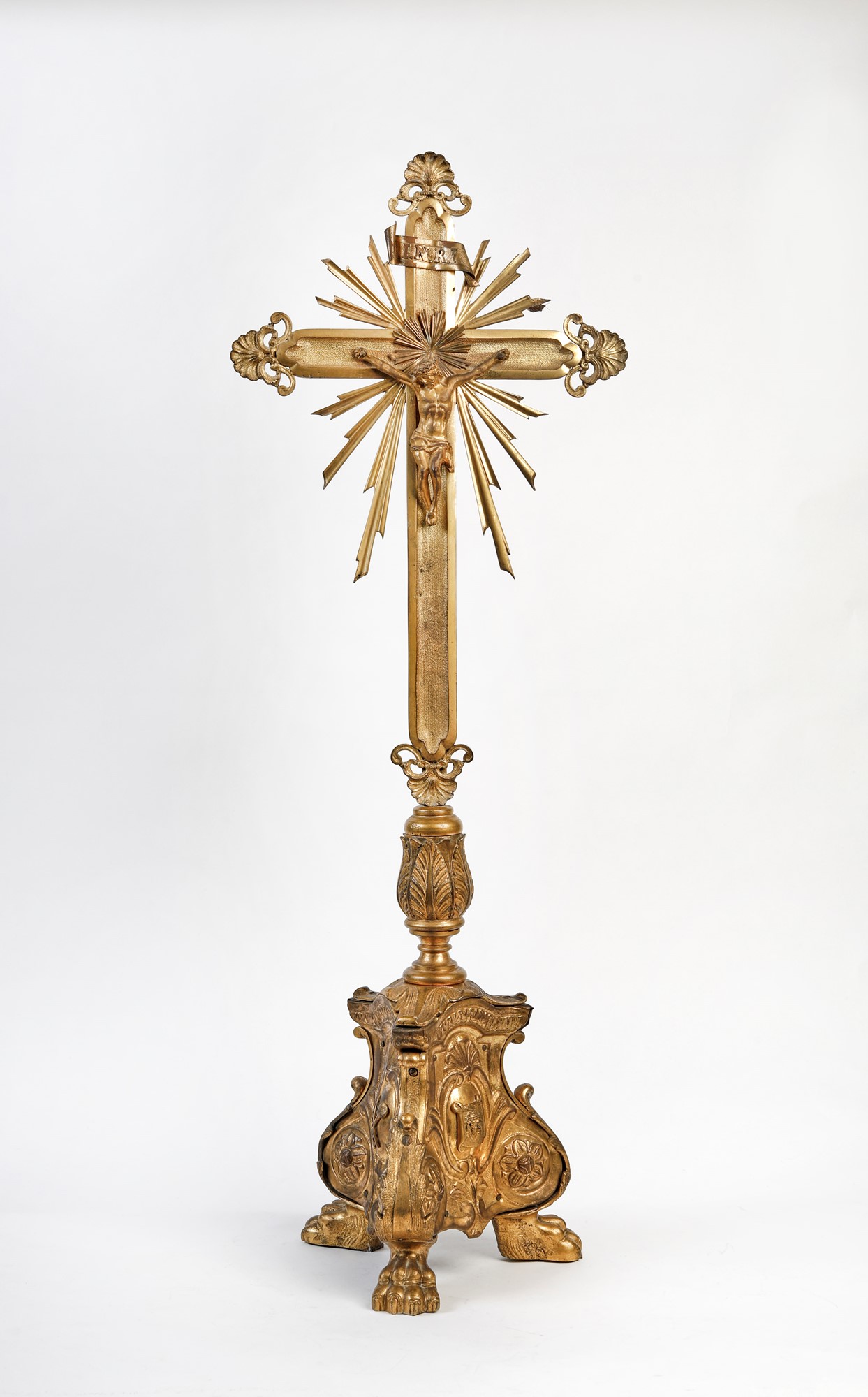 Crocifisso in bronzo dorato su basamento. Fine del XVIII secolo. Cm 75x28.