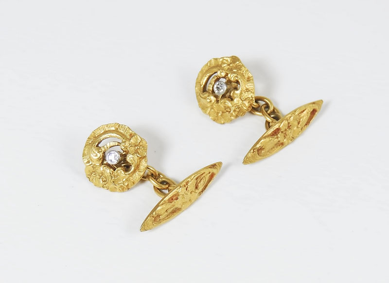 PAIO DI GEMELLI IN ORO GIALLO di forma rotonda, cesellati in stile floreale, ciascuno impreziosito da un piccolo diamante gr 8 PAIR OF GOLD AND DIAMONDS CUFFLINKS