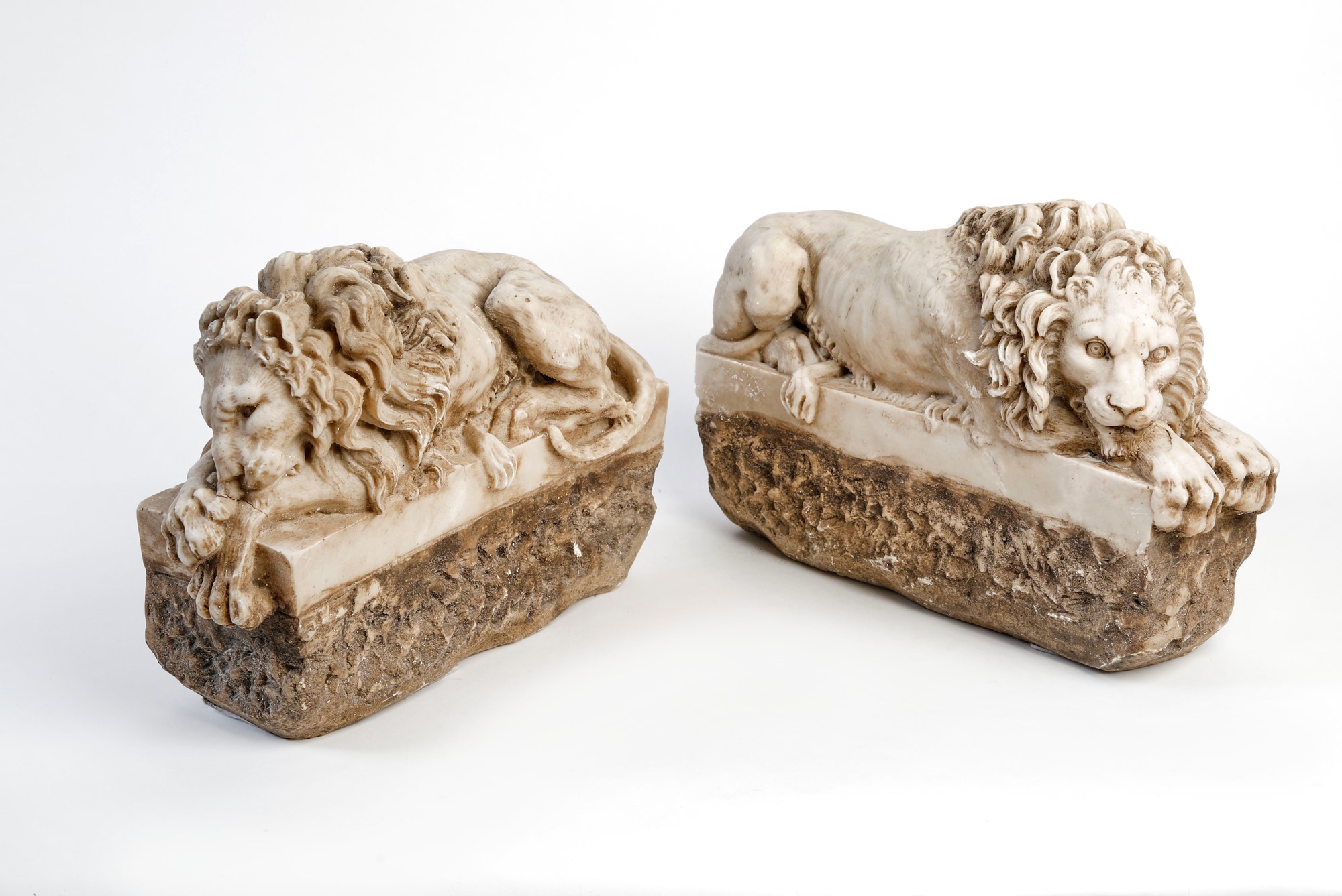 Coppia di sculture in marmo raffiguranti due leoni su basamento. XIX secolo. Cm 20x30x9.