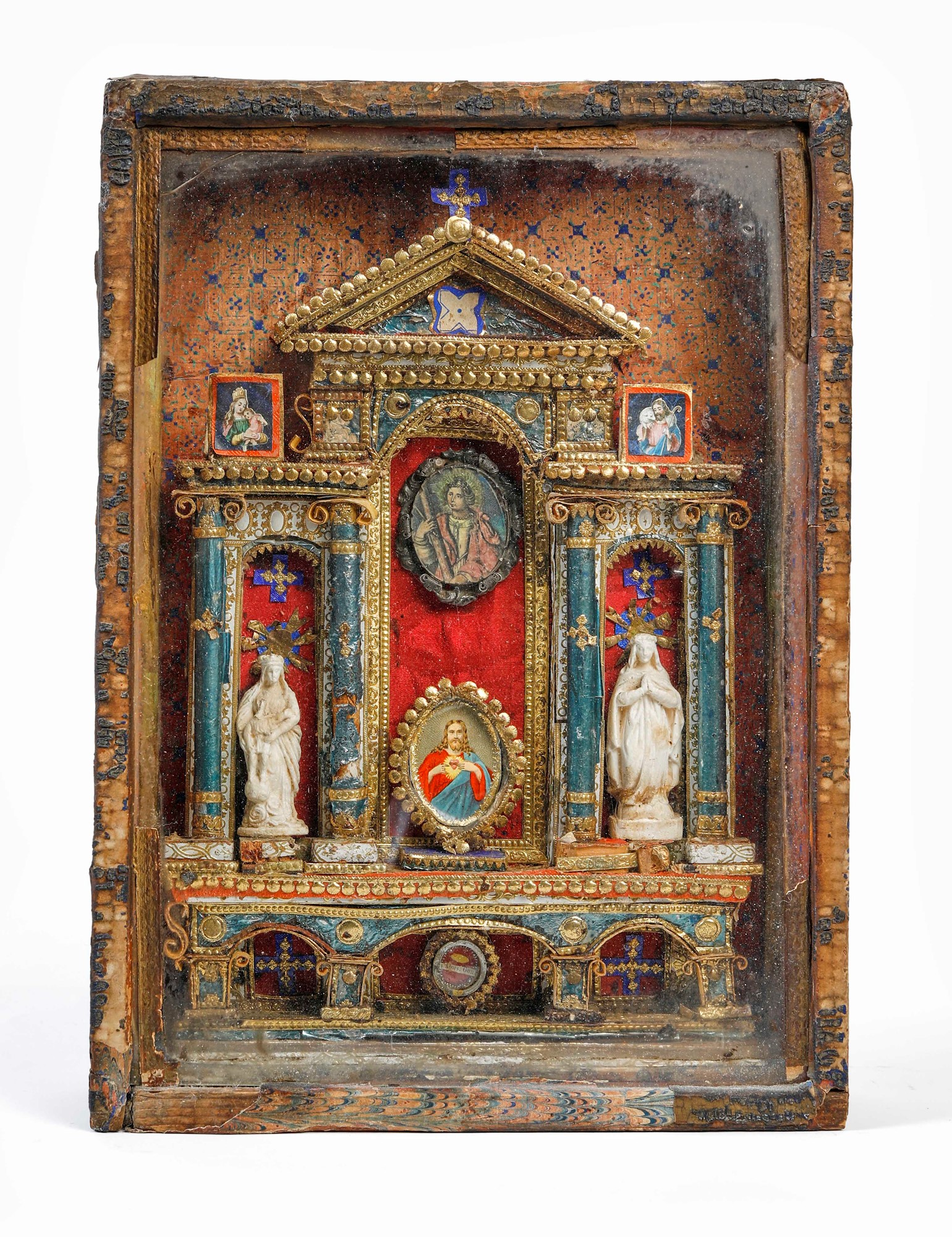 Teca reliquiario contenente una riproduzione d’altare realizzato con collage di cartine, stoffe, corde, strass statuine, stampe, in cornice di legno. XIX secolo Cm 35x25x6,5