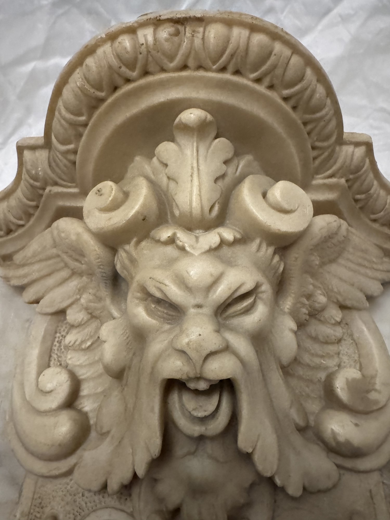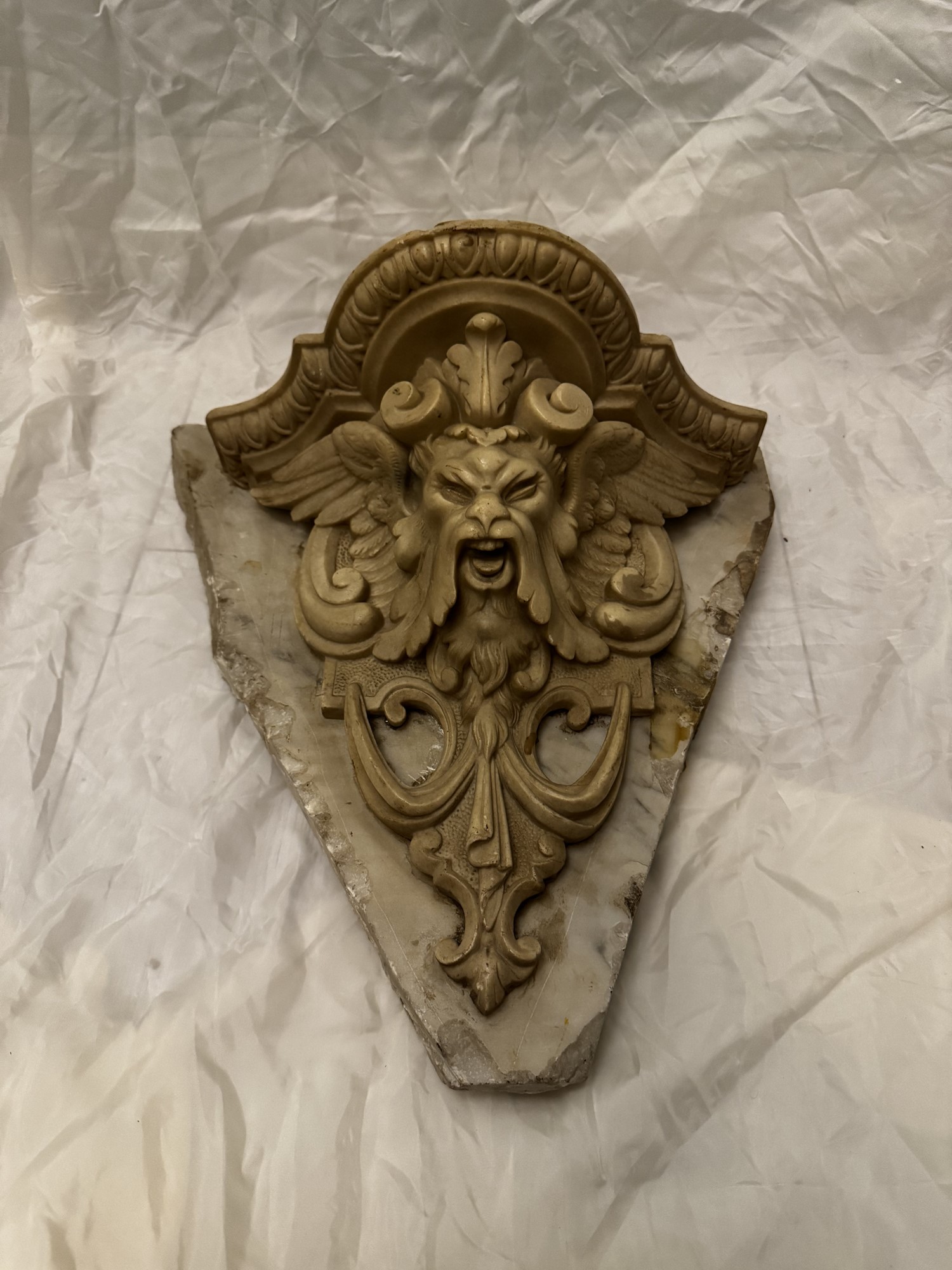 Mensola in marmo Gargoyle Satyr. XIX secolo. Al retro reca placca non coeva per appendere la mensola al muro. Cm (con supporto) 40x37.