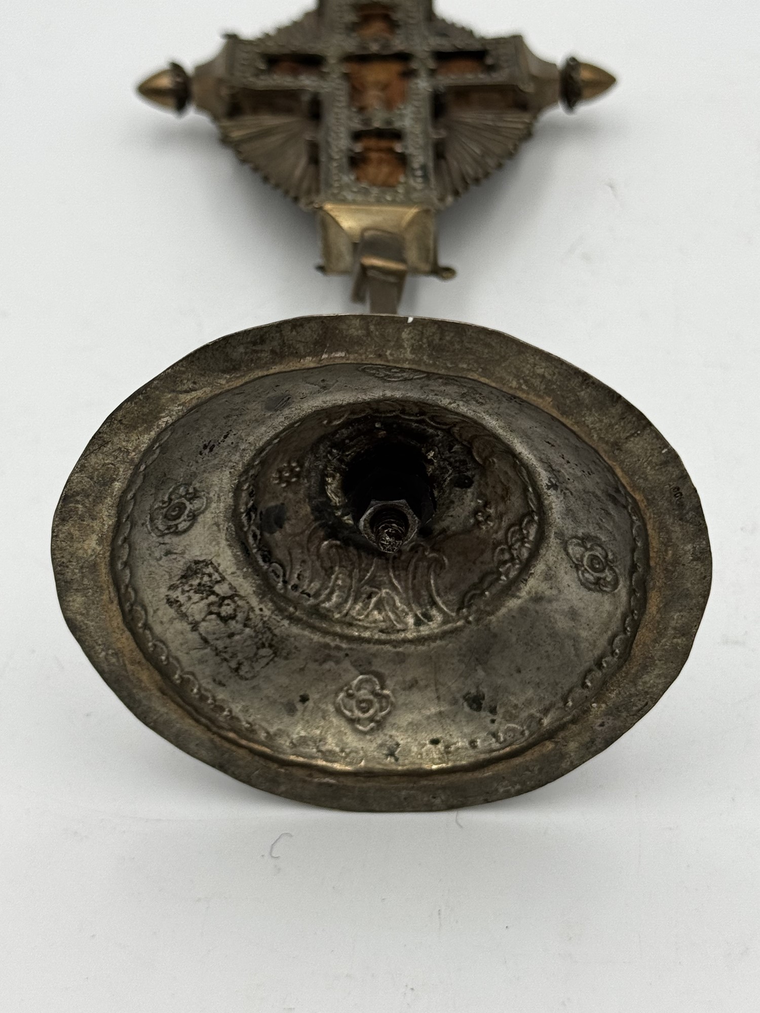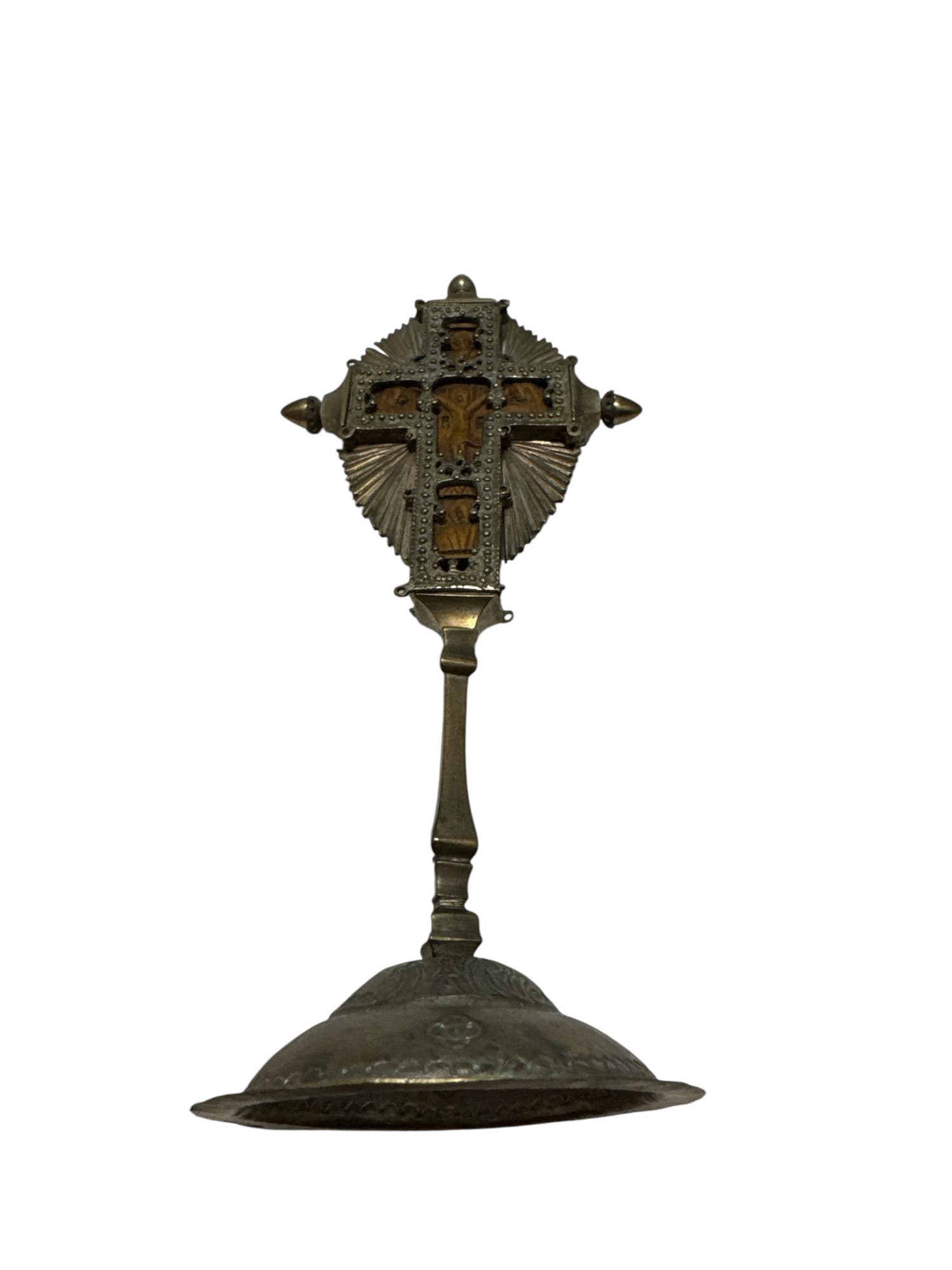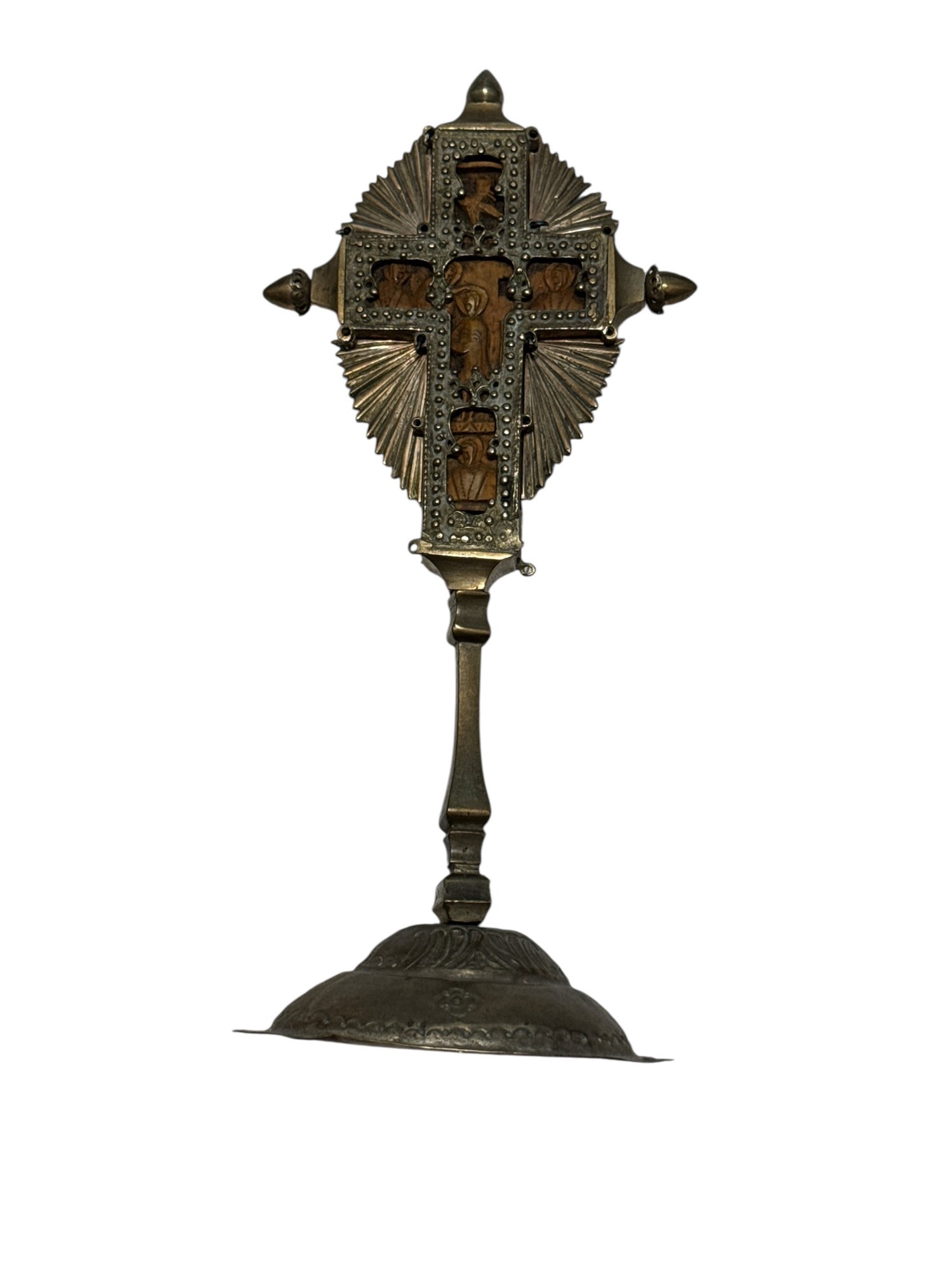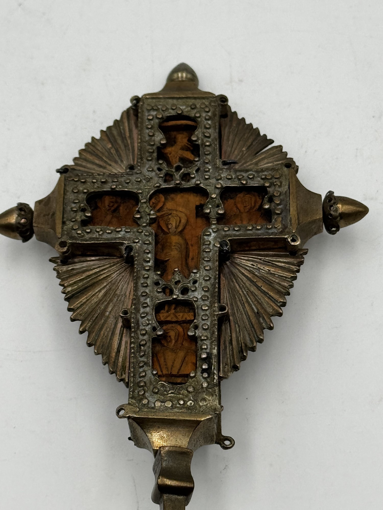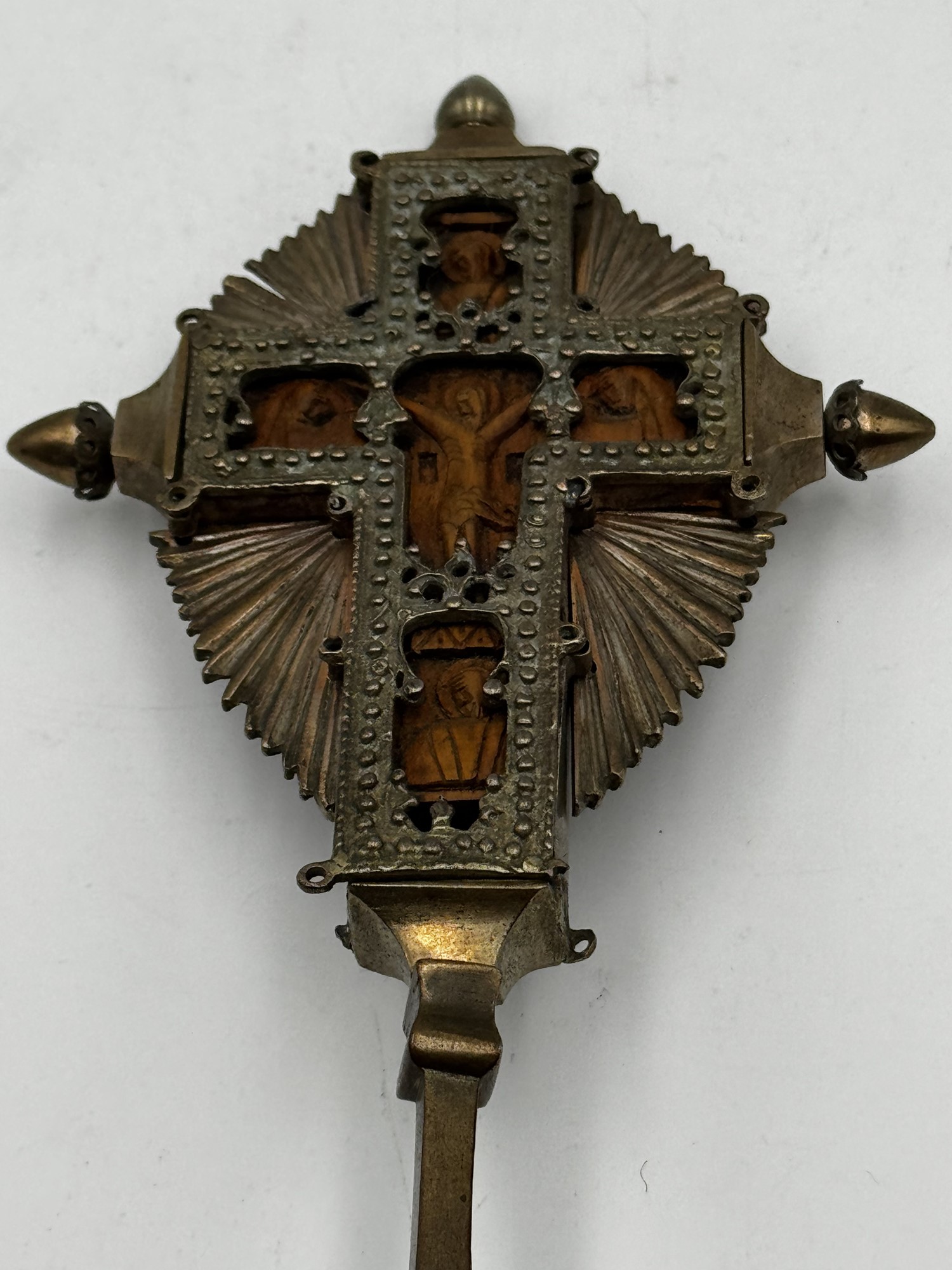 Croce in bosso con montatura in metallo. Grecia, XIX - XX secolo. Raffigurante la Crocifissione e il Battesimo di Cristo. Cm 21x9,5
