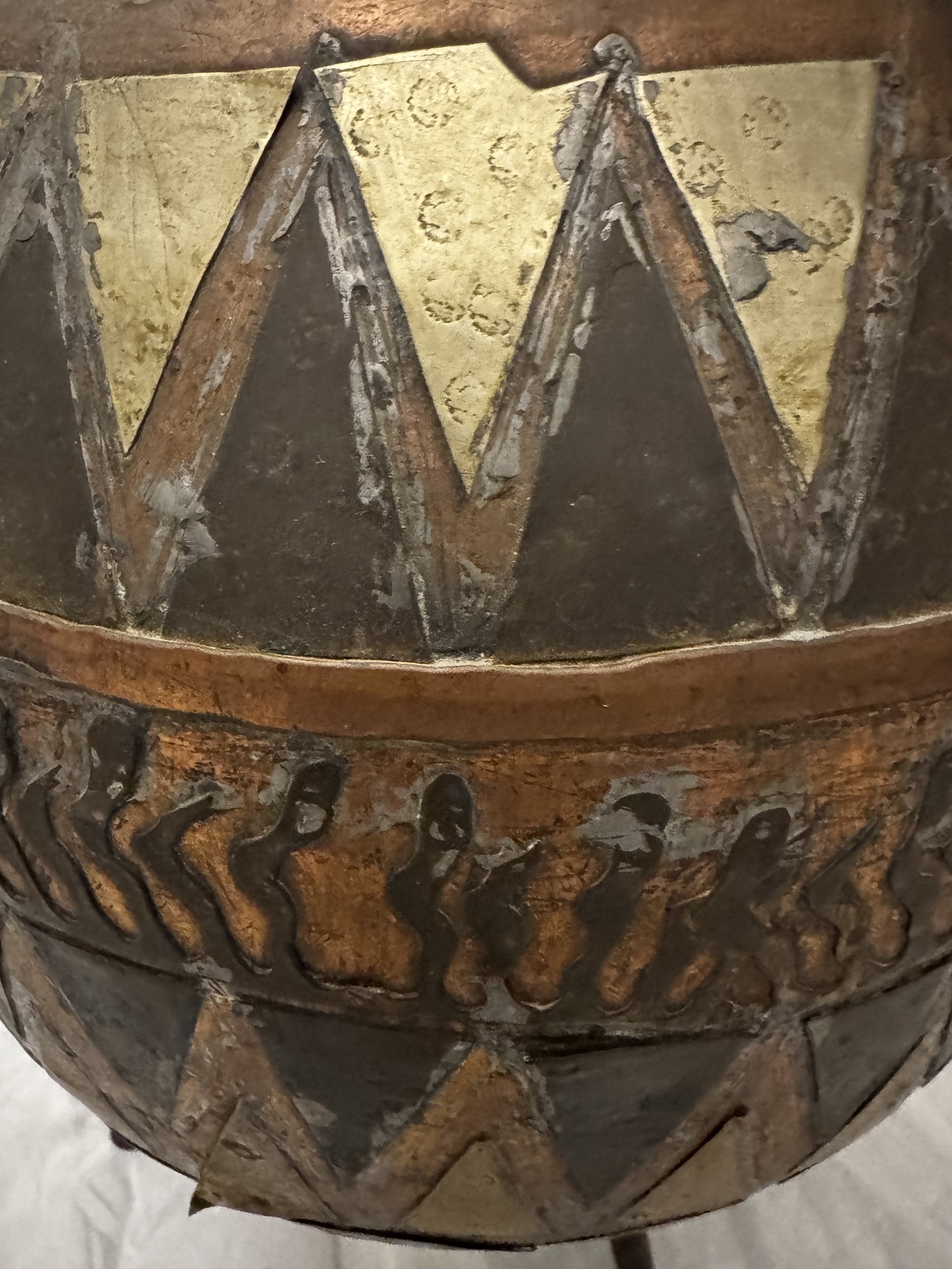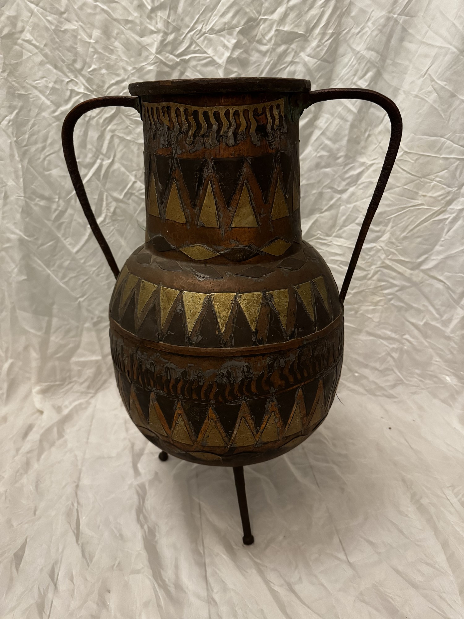 Anfora portaombrelli in rame con inserti lavorati a mano. XX secolo, Italia. Cm 60x39.