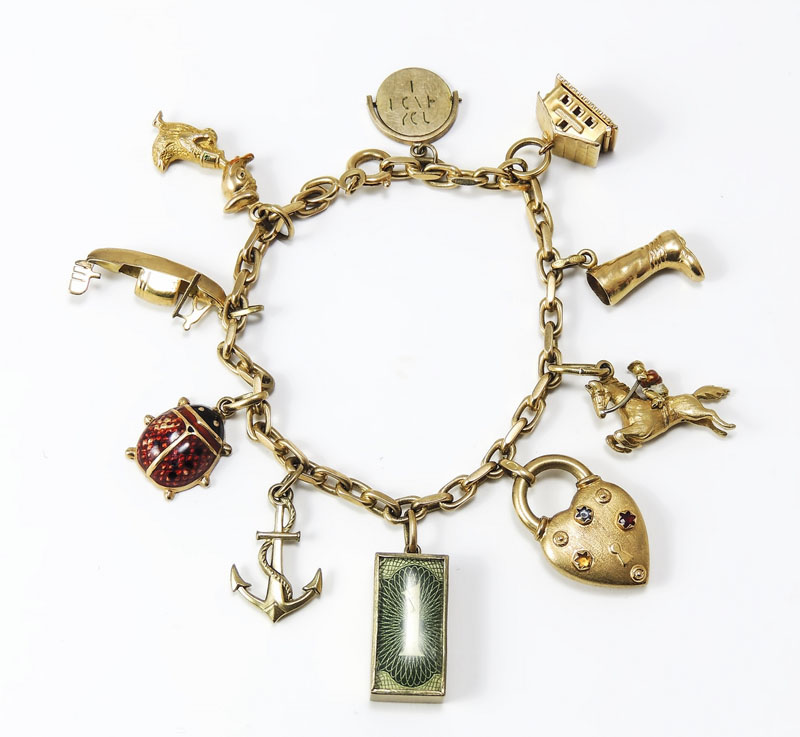 BRACCIALE CHARMS IN ORO GIALLO con pendenti fantasia prevalentemente inglesi gr 36,2 CHARMS GOLD BRACELET