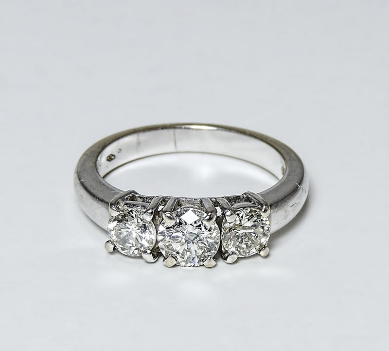 ANELLO TRILOGY IN ORO BIANCO con tre diamanti taglio brillante rotondo ct 1,30 circa complessivi, gr 4,9 TRILOGY GOLD AND DIAMONDS RING