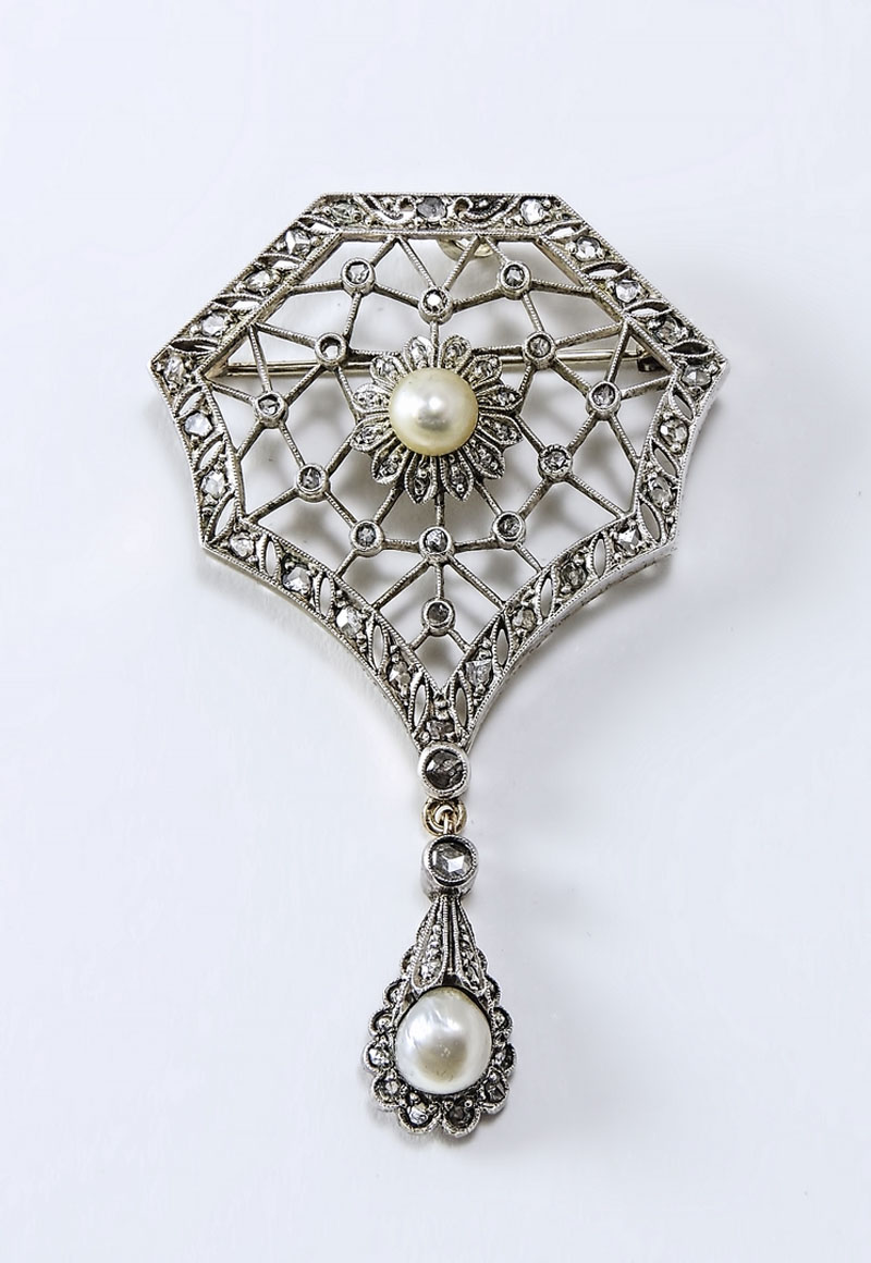 SPILLA IN ORO GIALLO, ARGENTO E PERLE traforata e impreziosita con diamanti...