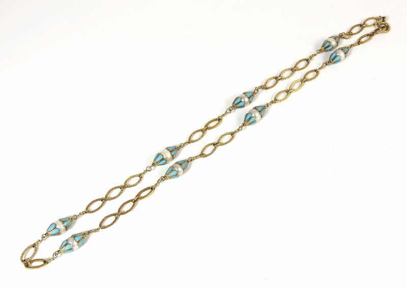 COLLANA IN ORO GIALLO, PERLE E SMALTI Tiffany realizzata a maglie ovali martellate alternate a perle rilegate con motivo a corolla in oro e smalto turchese gr 24 Reca punzone: Tiffany & Co ENAMELLED GOLD AND PEARLS NECKLACE, TIFFANY