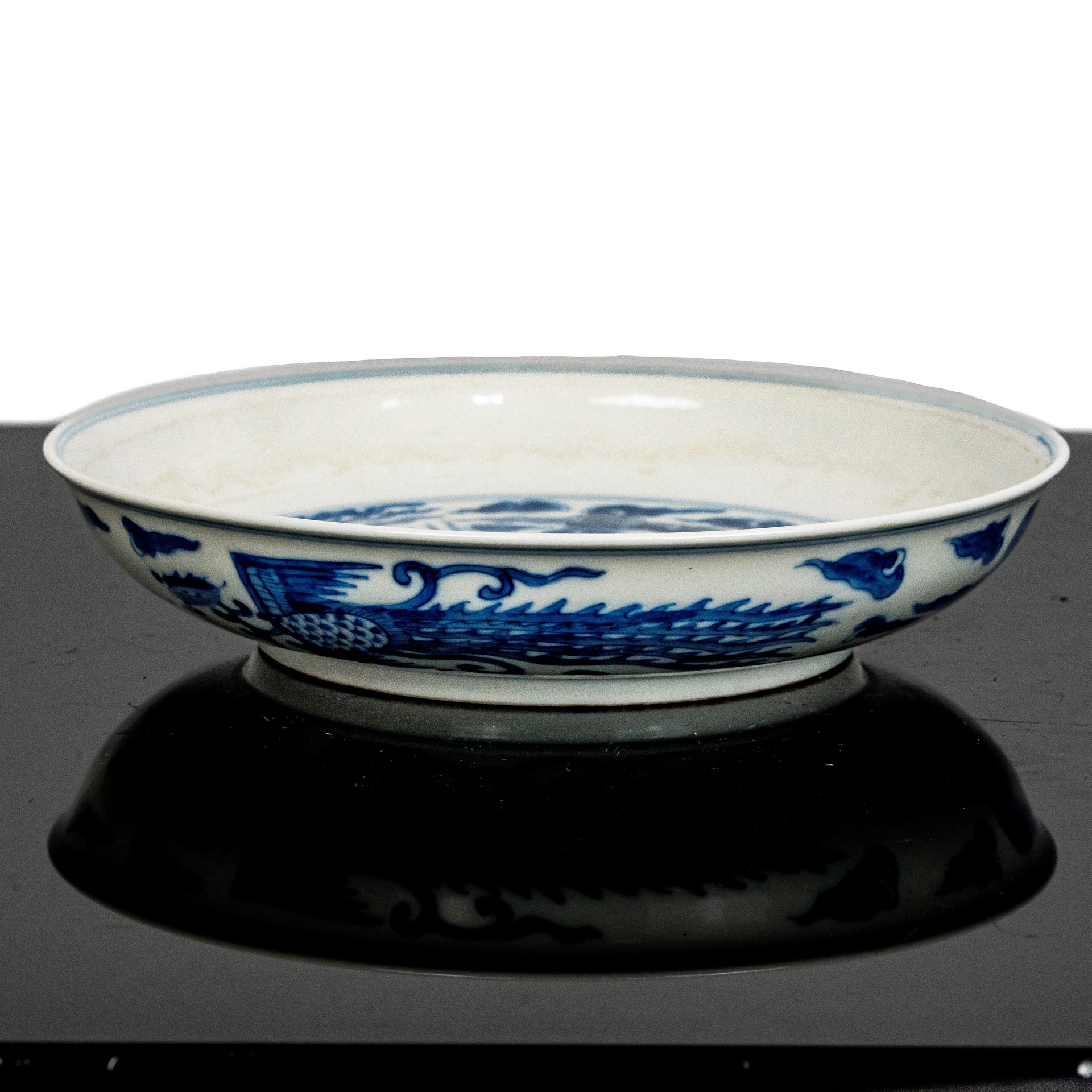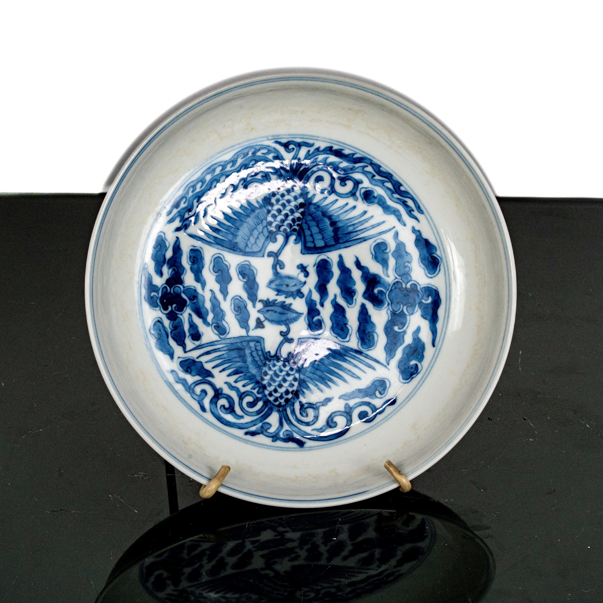 Piatto in porcellana bianca e blu con decori di fenici, Qing , Dinastia, Guangxu , periodo