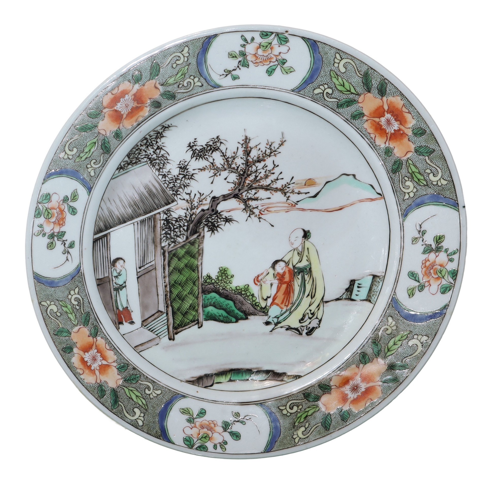 Piatto in ceramica cinese dinastia Qing , periodoo Kangxi con raffigurazione di un maestro con allievo, 17° secolo diametro cm 23