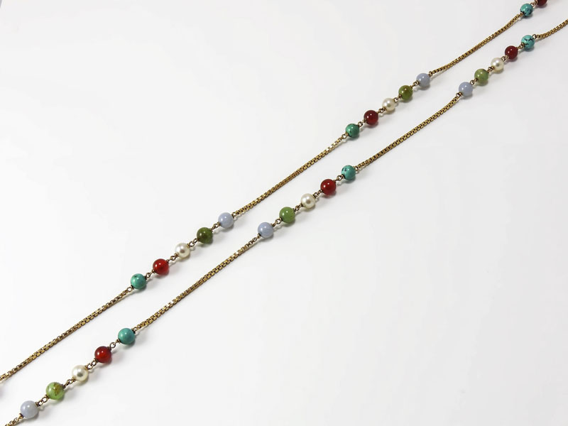 LUNGA CATENA IN ORO GIALLO, PIETRE PREZIOSE E PERLE realizzata a maglie intercalate da sfere di calcedonio, corniola, turchese, nefrite e perle di acqua salata GR 56,8 LONG GOLD CHAIN WITH PRECIOUS STONES AND PEARLS
