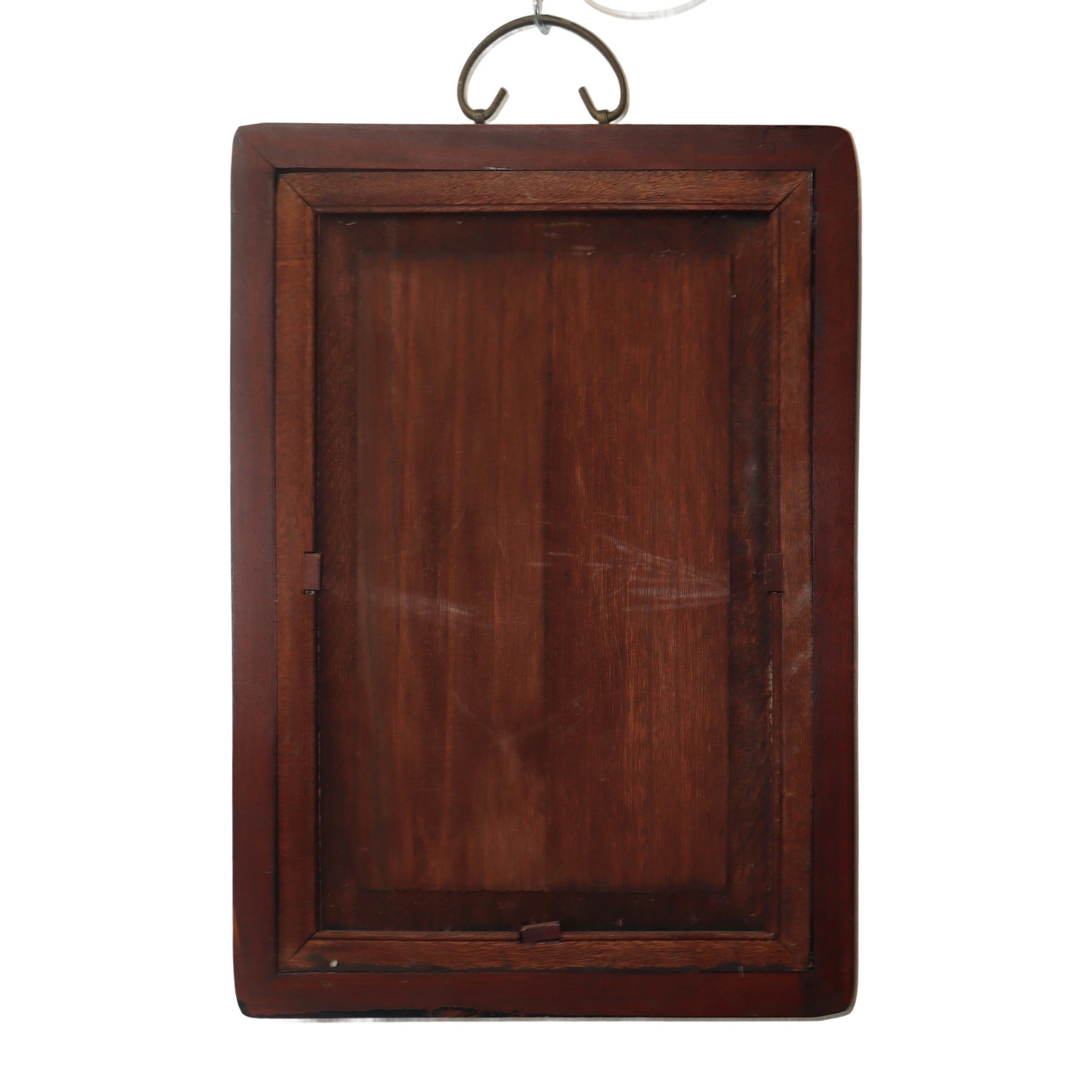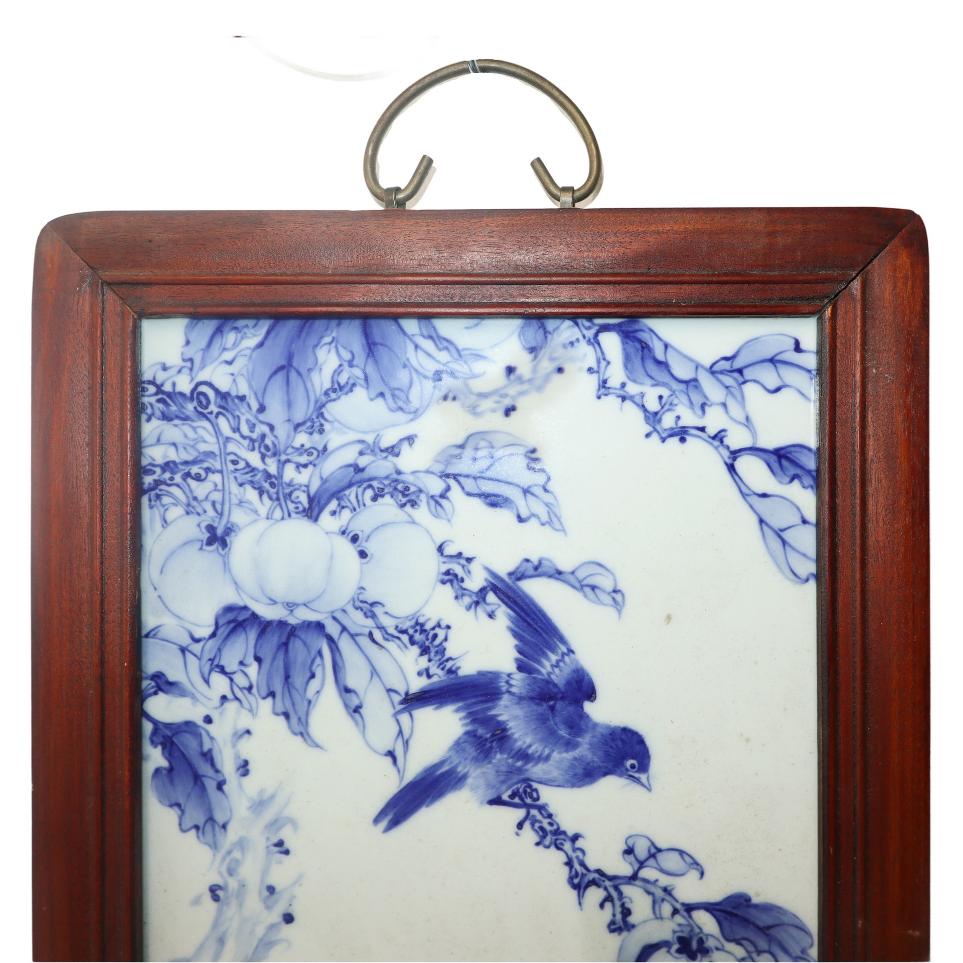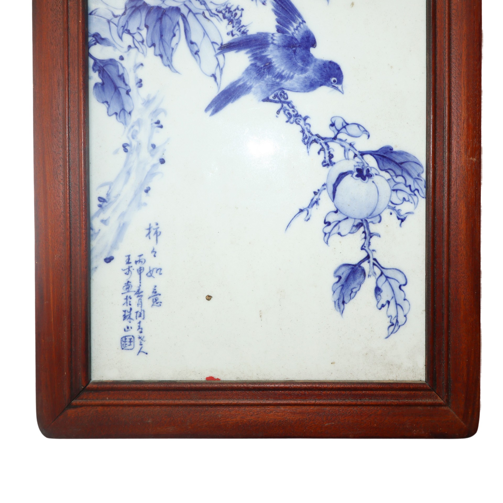 Bu Weng (Fengcheng 1898 - 1968) - Mattonella cinese in ceramica bianca dipinta con uccelli e frutti e iscrizione nei toni del blu h cm 30X42 Con cornice in legno marrone Con cornice in legno marrone