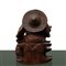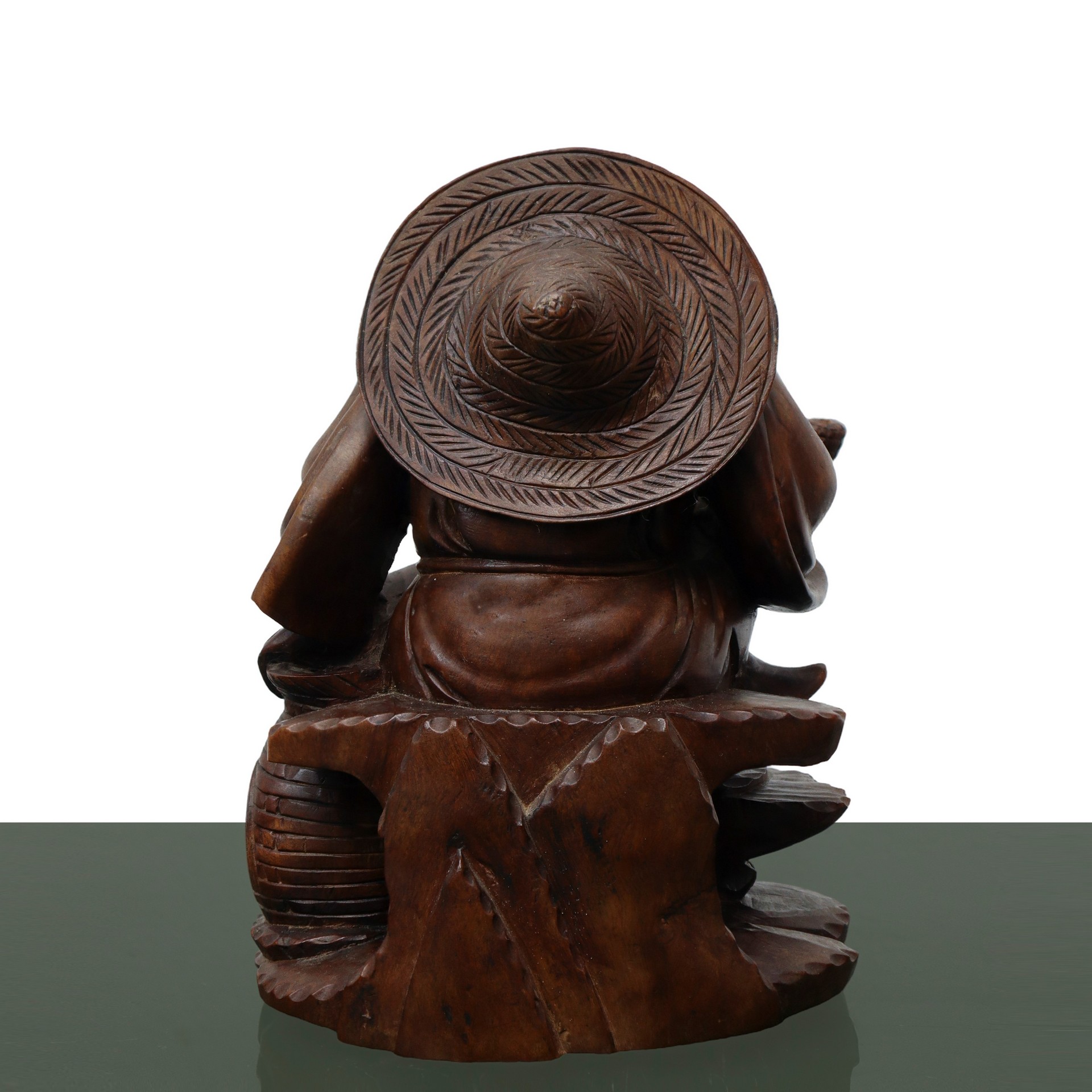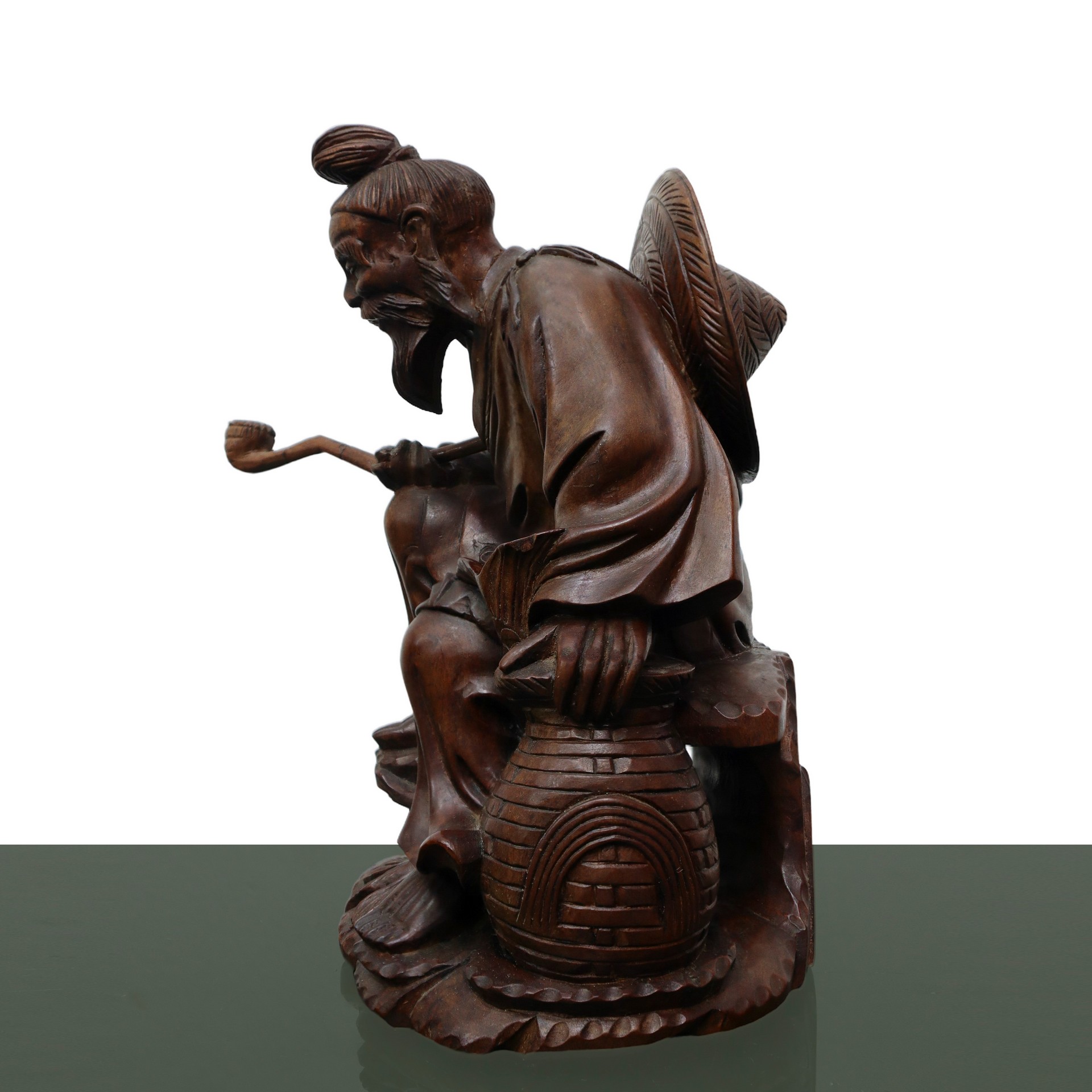 Scultura in legno intagliato di un uomo con la pipa H cm 21x15 Scultura in legno di un uomo in posizione seduta con abiti e acconciatura orientali. Afferra con la mano destra una pipa e regge con la mano sinistra un cesto con pesci. Sono presenti delle fessurazioni nel legno.Scultura in legno di un uomo in posizione seduta con abiti e acconciatura orientali. Afferra con la mano destra una pipa e regge con la mano sinistra un cesto con pesci. Sono presenti delle fessurazioni nel legno.