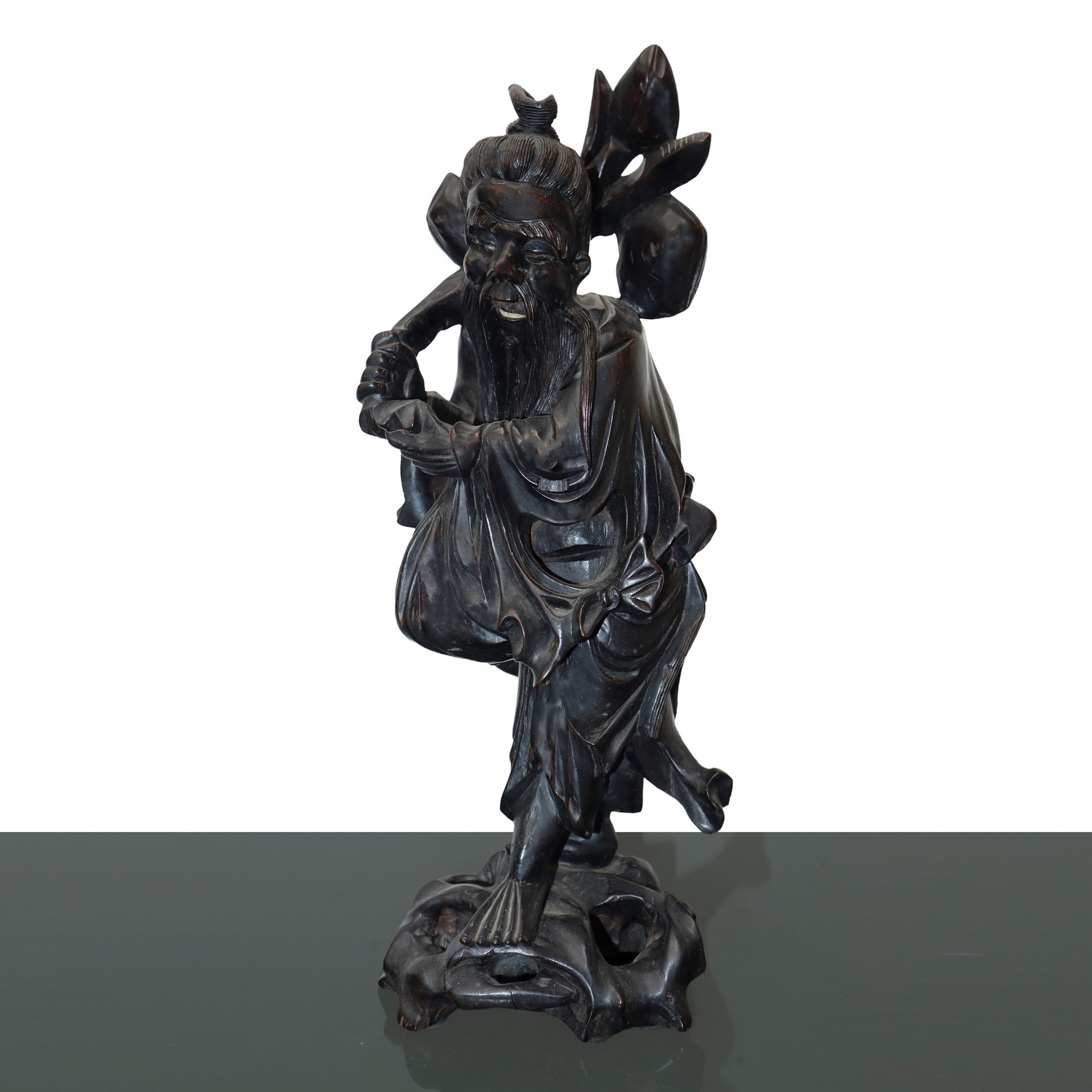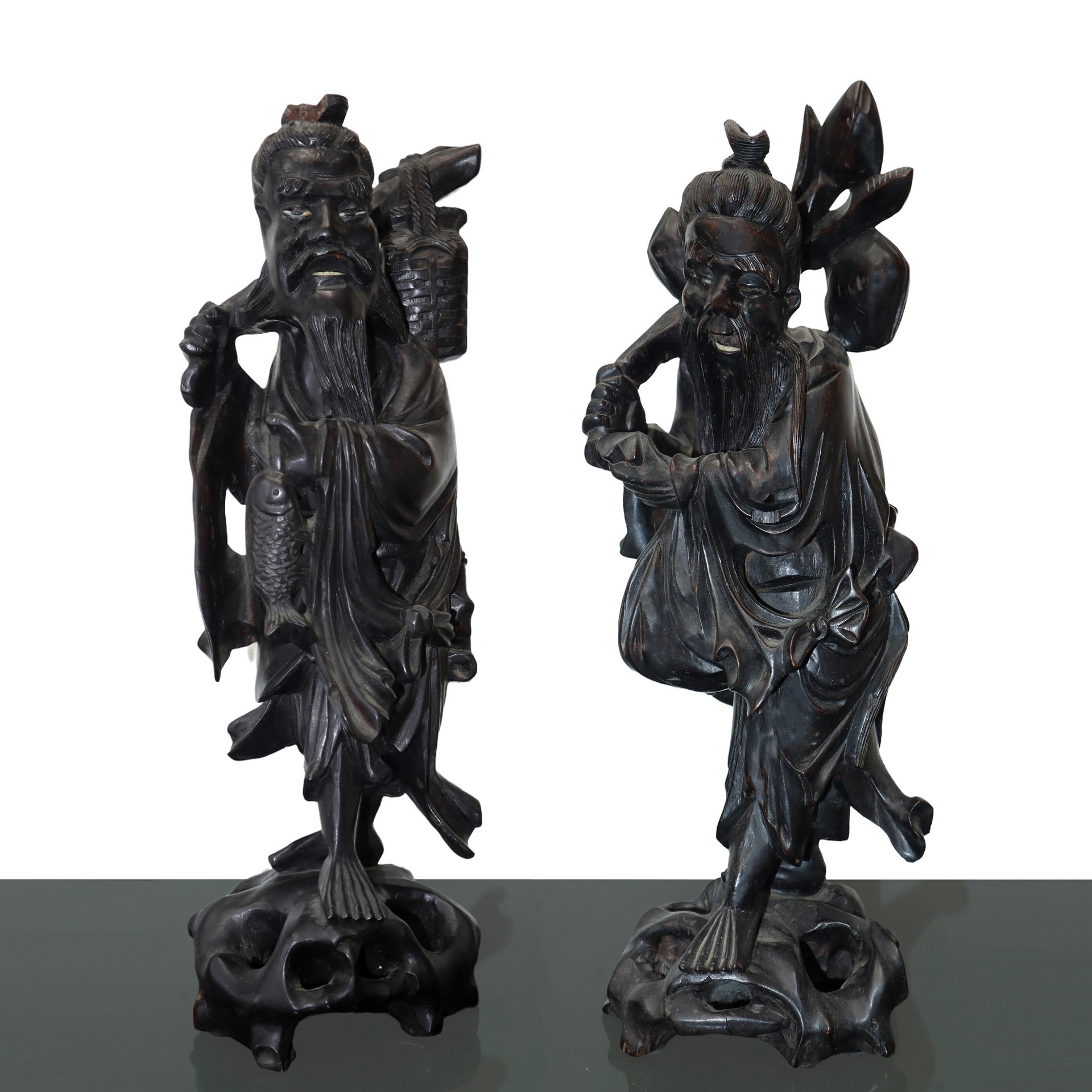 Coppia di statuine in legno intagliato del dio Shoulao H cm 40.5x14.5 Coppia di statuine lignee del dio taoista Shoulao. Denti e occhi in bianco. Le sculture raffigurano il dio come un uomo anziano dalla lunga barba, la testa allungata, abiti e acconciature orientali. La prima scultura rappresenta il dio che regge con la mano sinistra un pesce e con la mano destra un bastone con un cesto. Lo chignon è leggermente sclafito. La seconda scultura raffigura il dio con un ramo fiorito. La seconda scultura è mancate di un occhio bianco.Coppia di statuine lignee del dio taoista Shoulao. Denti e occhi in bianco. Le sculture raffigurano il dio come un uomo anziano dalla lunga barba, la testa allungata, abiti e acconciature orientali. La prima scultura rappresenta il dio che regge con la mano sinistra un pesce e con la mano destra un bastone con un cesto. Lo chignon è leggermente sclafito. La seconda scultura raffigura il dio con un ramo fiorito. La seconda scultura è mancate di un occhio bianco.