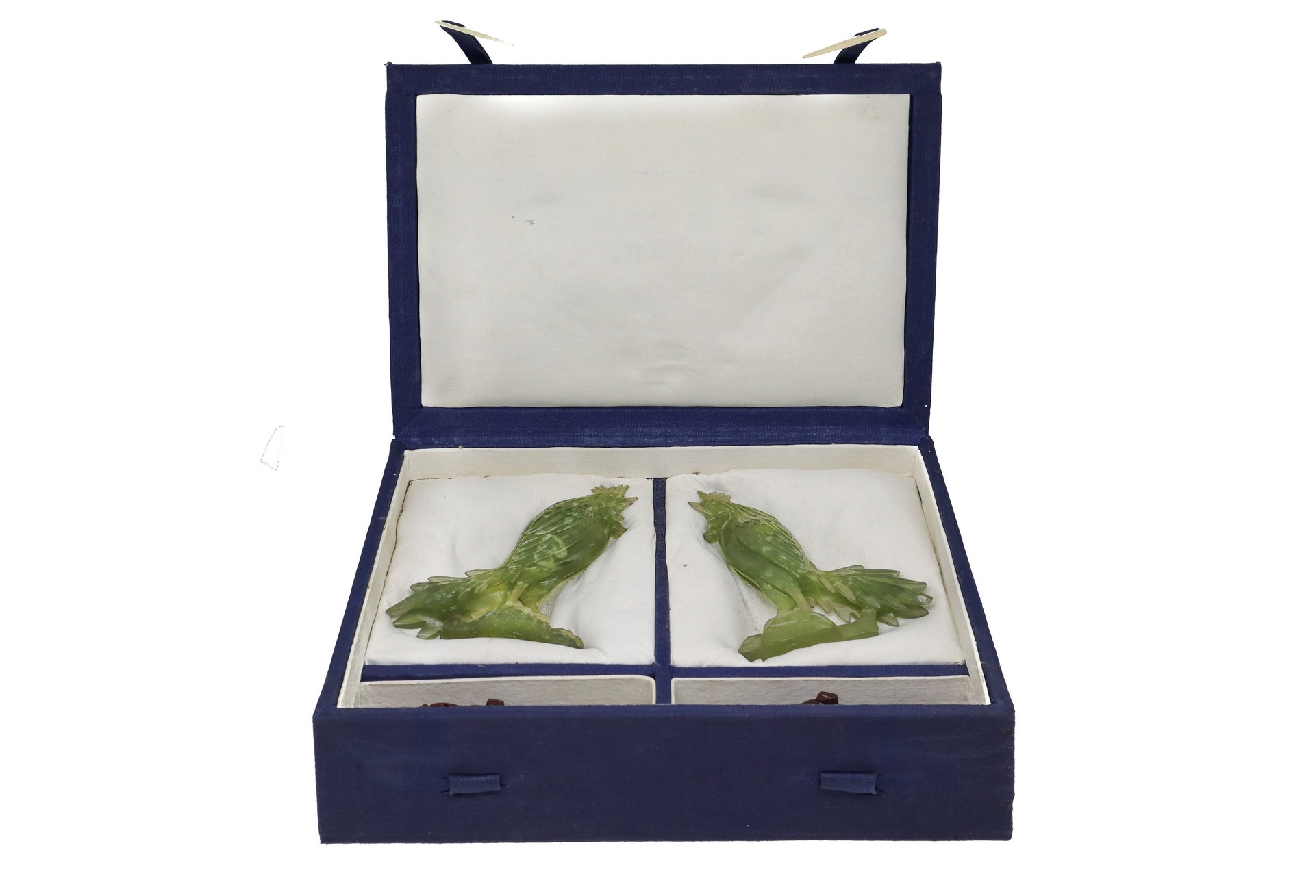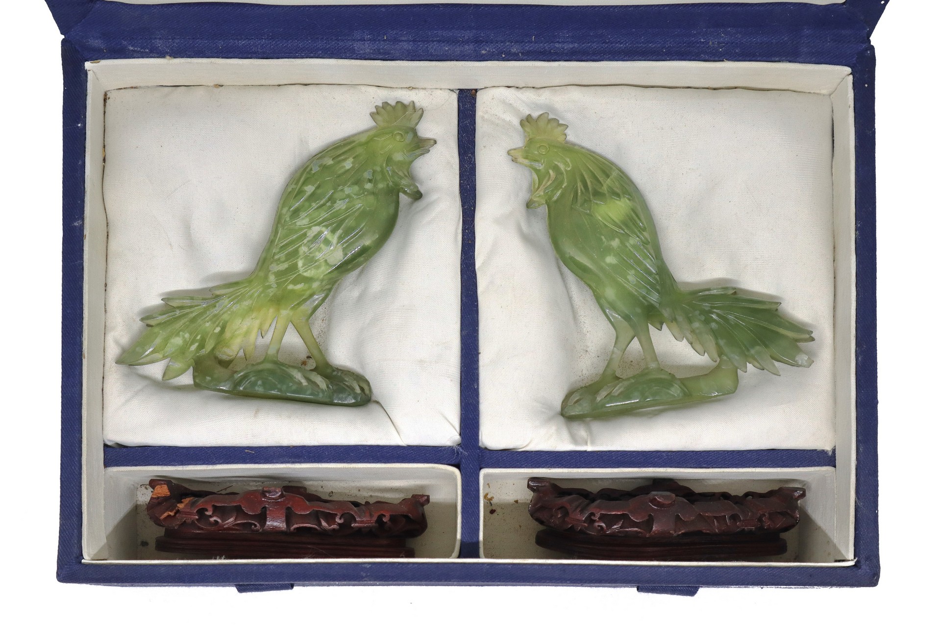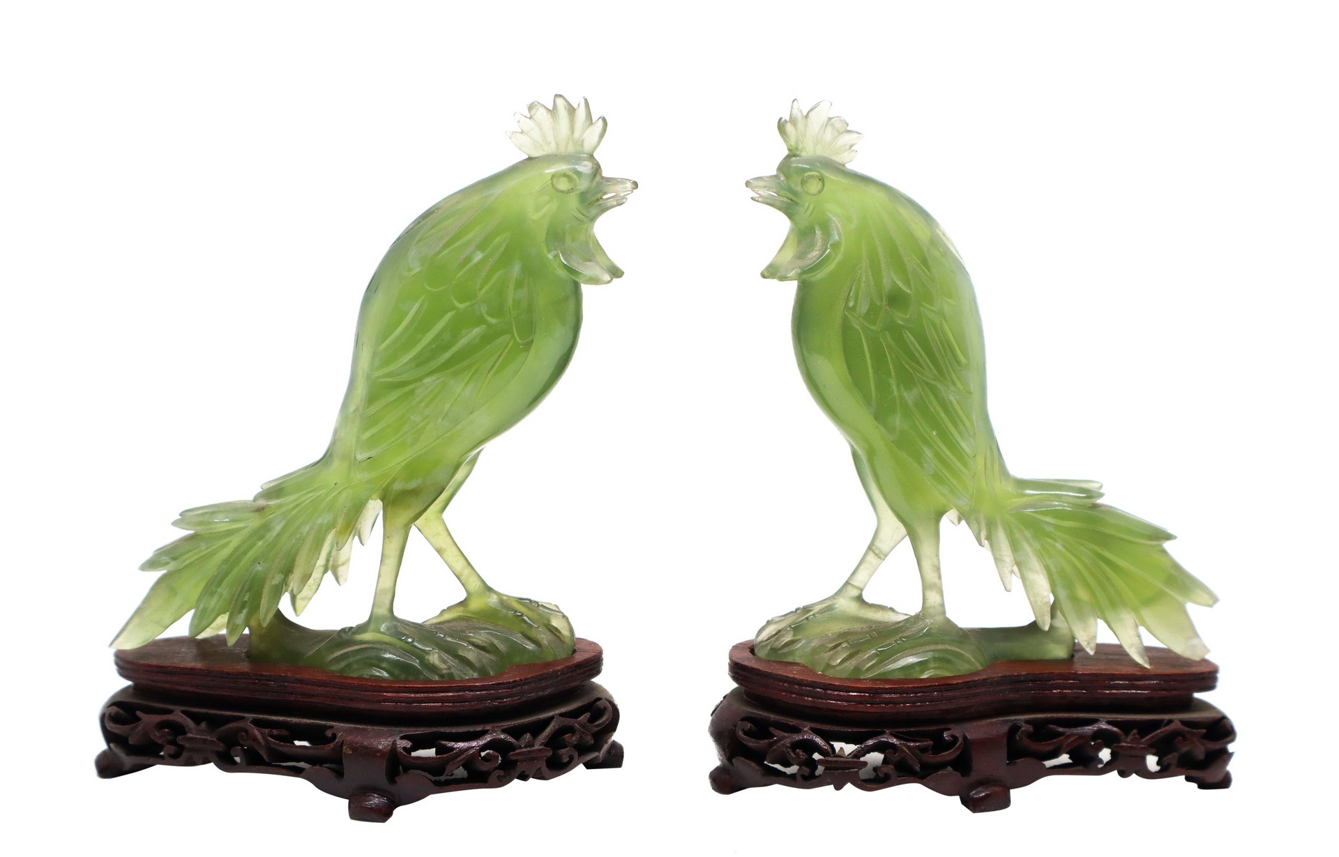 Galli in giada verde h cm 10 In una: minima sbeccatura in prossimità della codaIn una: minima sbeccatura in prossimità della coda